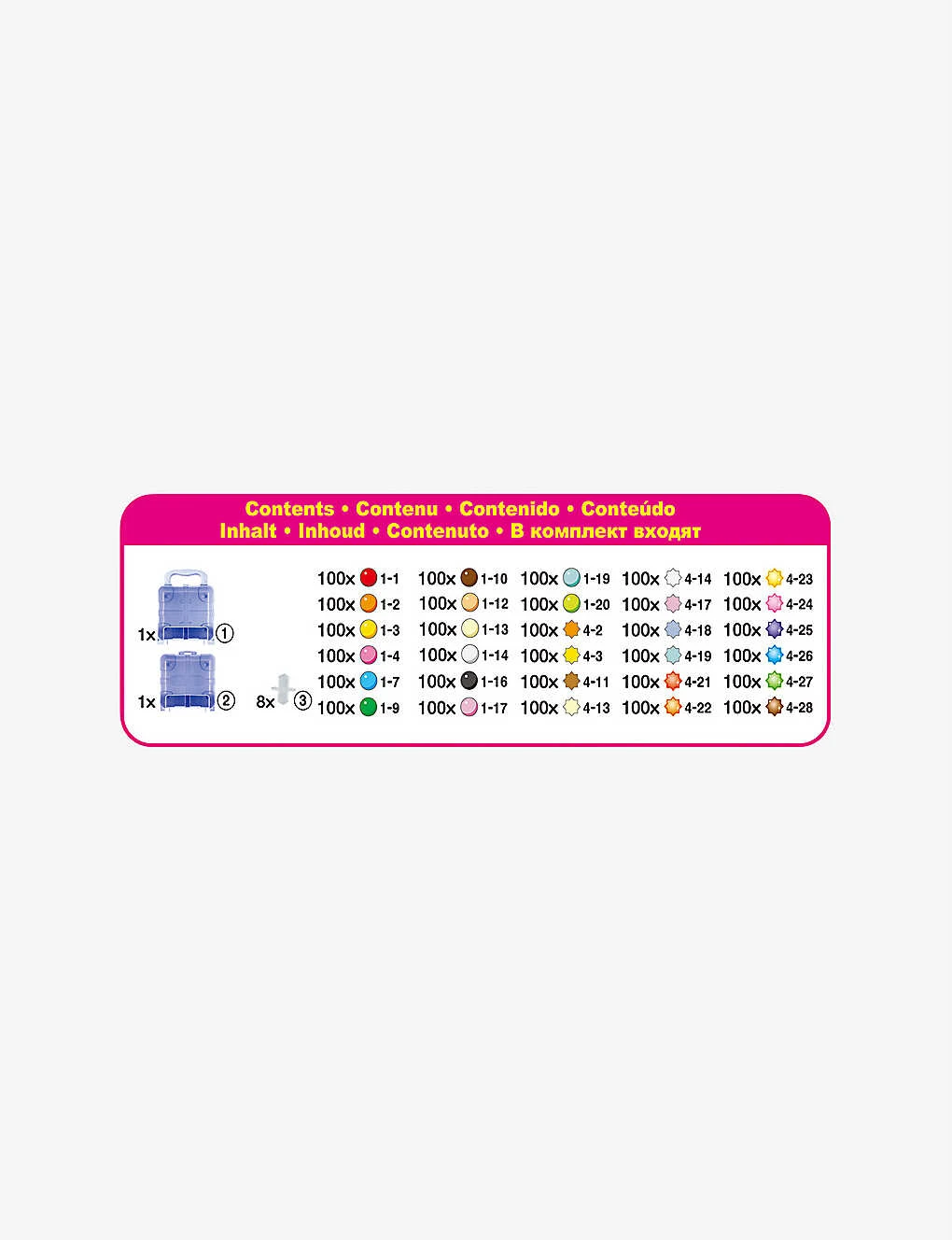 - Includes: 3000x beads of 30 colours (16x solids, 14x stars), 1x trunk, 4x design pegs