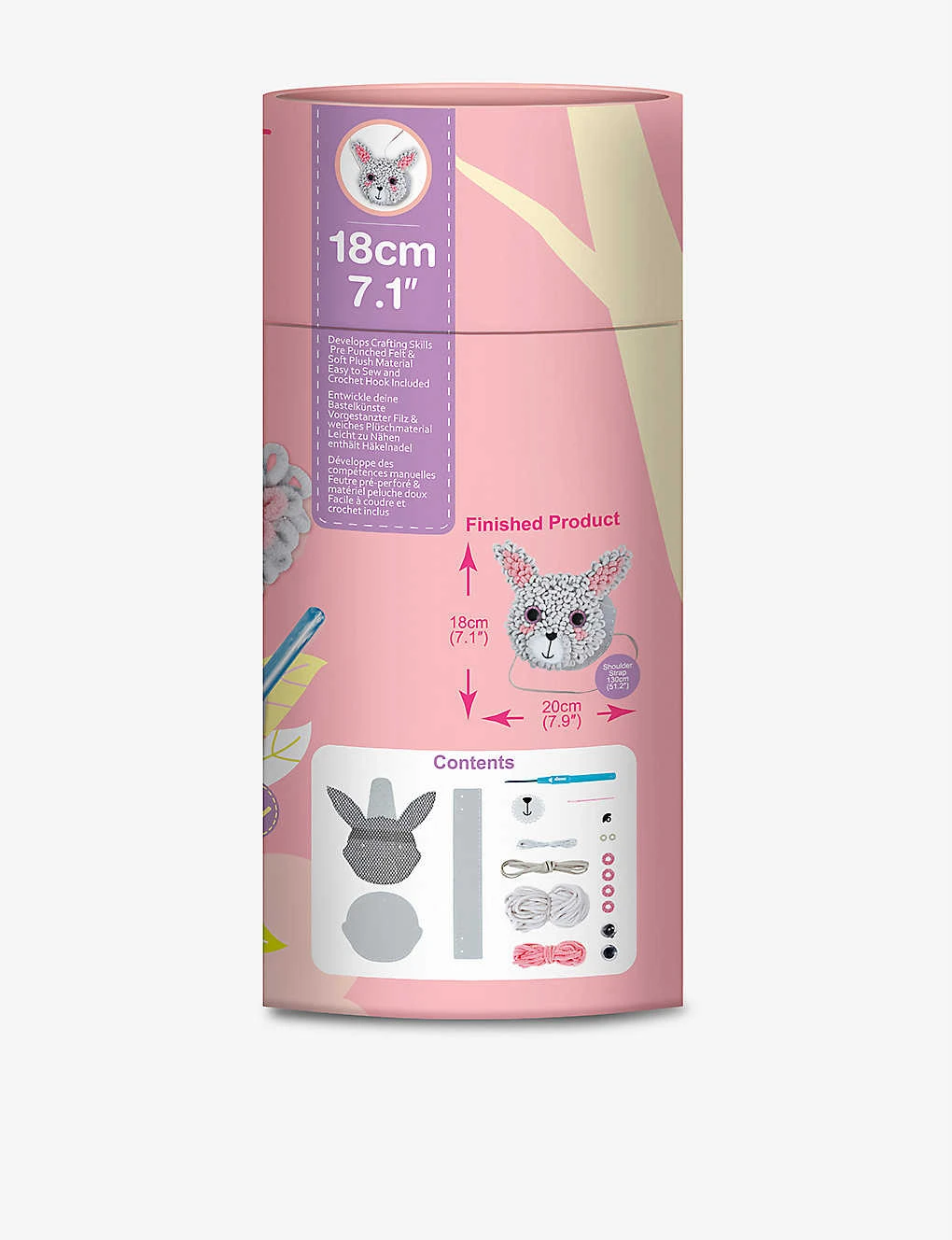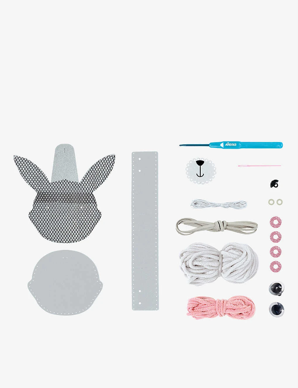 - Includes: 2 bunny-shaped fabric pieces, 1 grey fabric piece, 1 x white wool, 1 x pink wool, 1 x white sewing thread, 1 x shoulder strap, 2 x plastic eyes, 1 plastic needle, 1 button, 1 crochet hook, 1 set of instructions