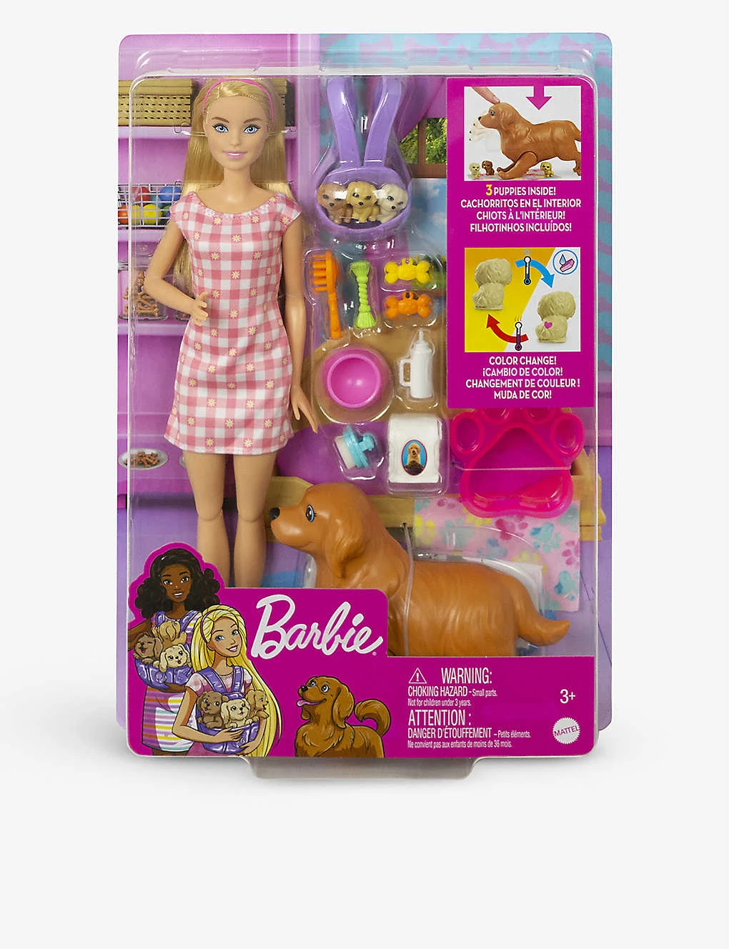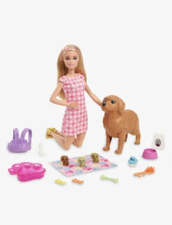- Barbie doll, mummy dog, three puppies, accessories included