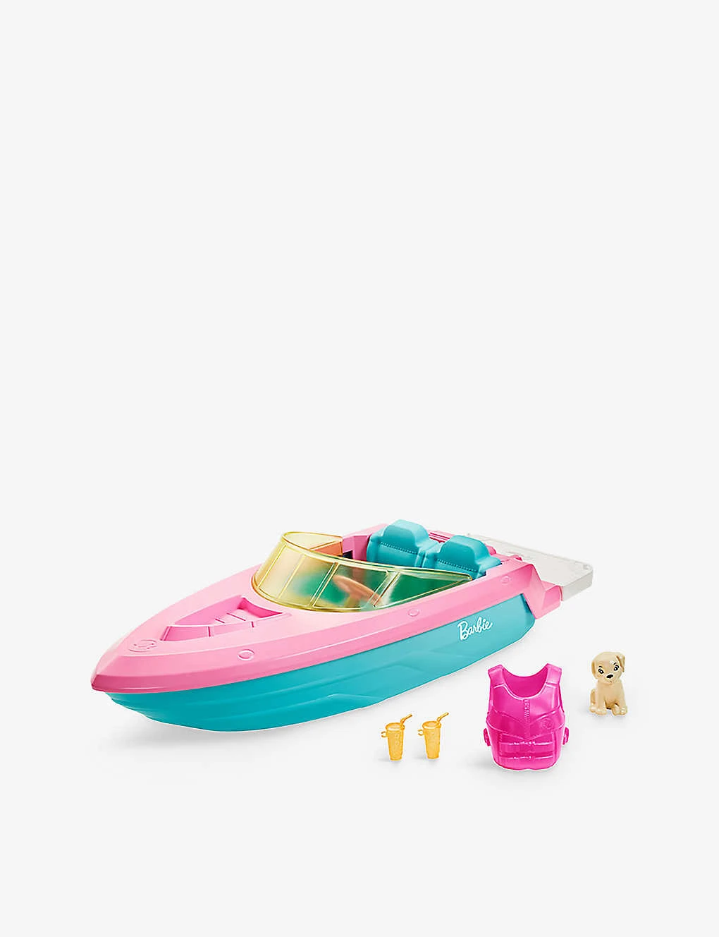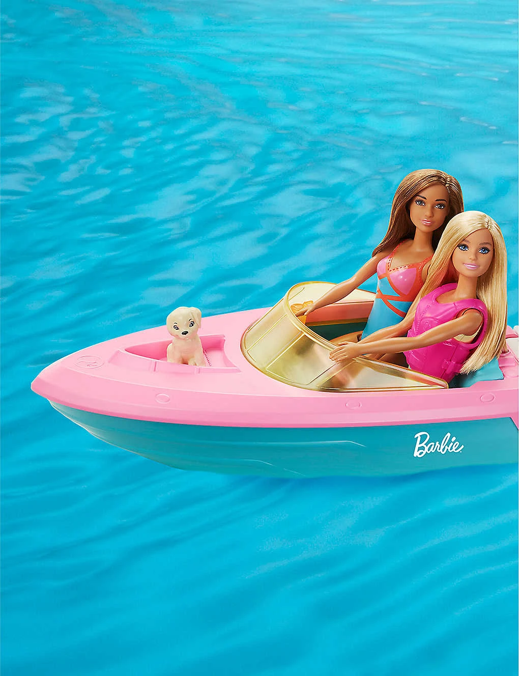 - Room for 3 Barbie dolls, special seat on the bow for toy dog, floatable design