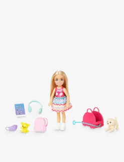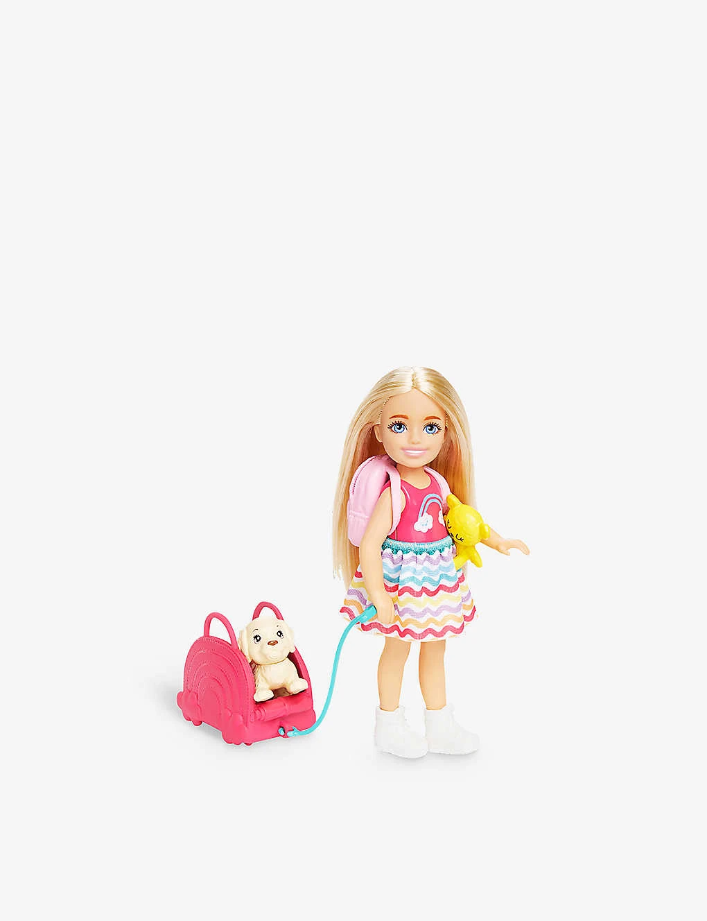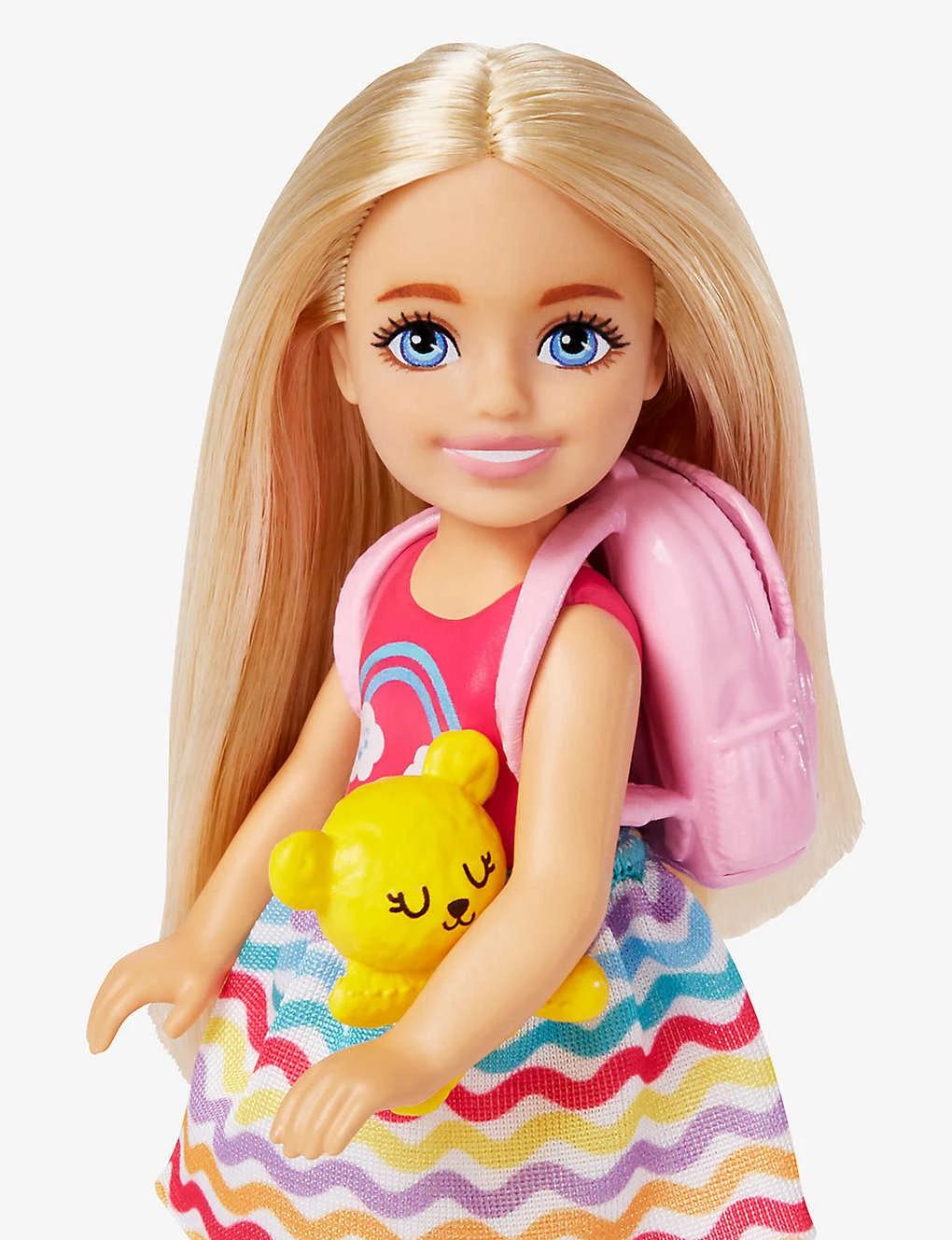 - Contains: 1 x Chelsea doll, 1 x puppy figure, 1 x teddy, 1 x dog basket to roll, 1 x backpack, 1 x tablet, 1 x headphones, 1 x mask, 1 x sticker set