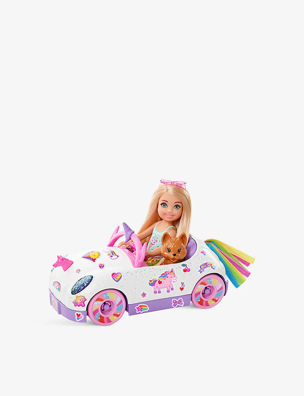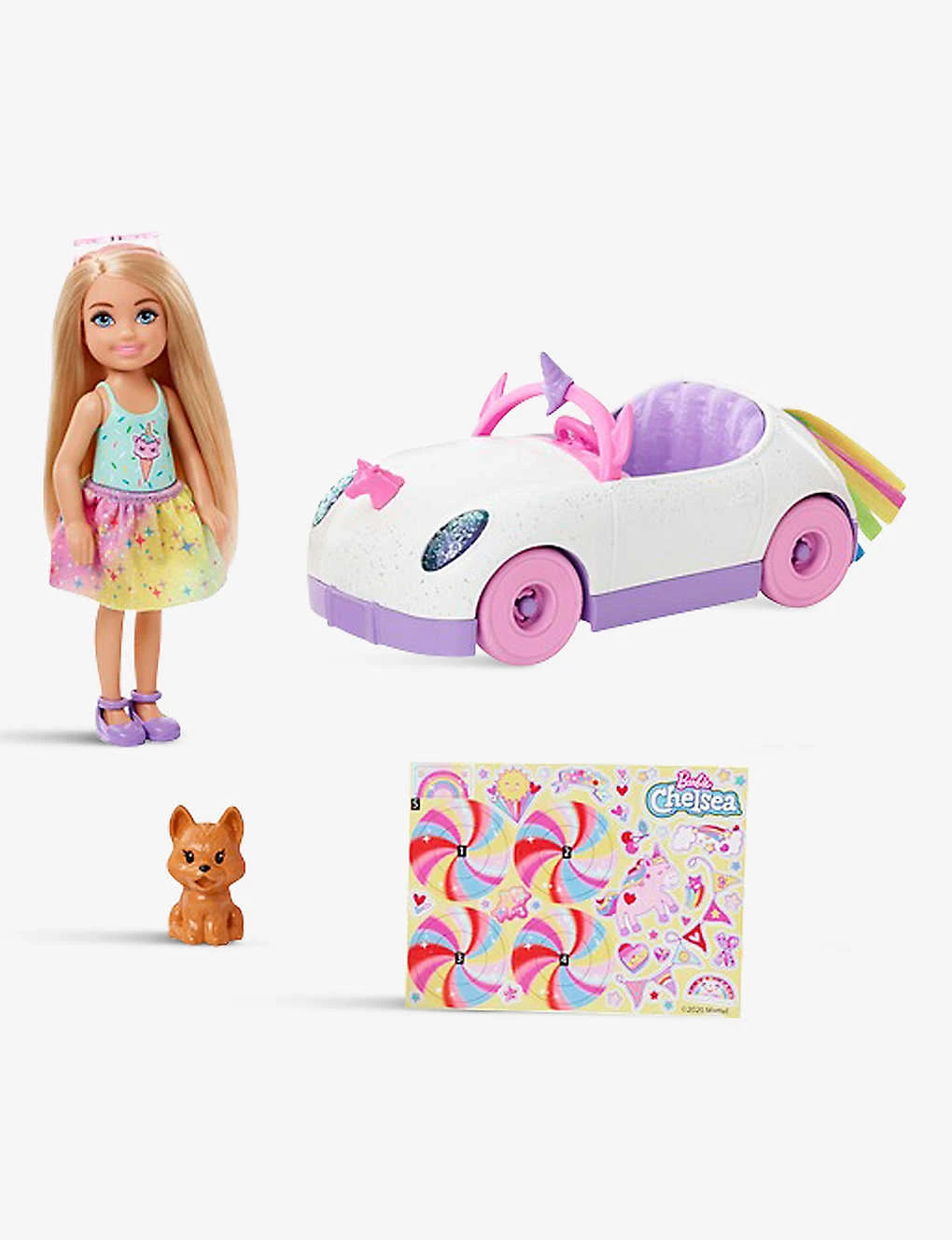 - Includes: Barbie Chelsea doll, a unicorn-themed top, removable tie-dye skirt, silver doll shoes and pink sunglasses