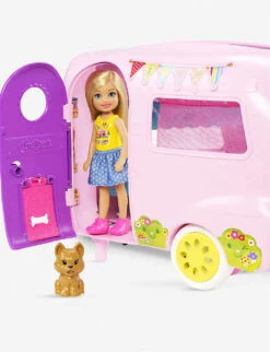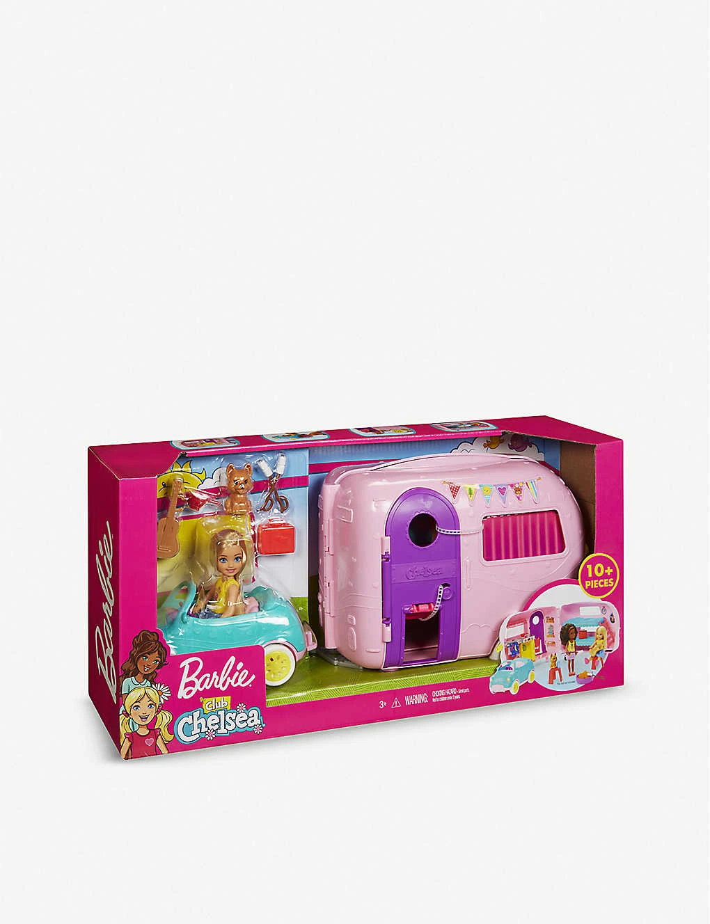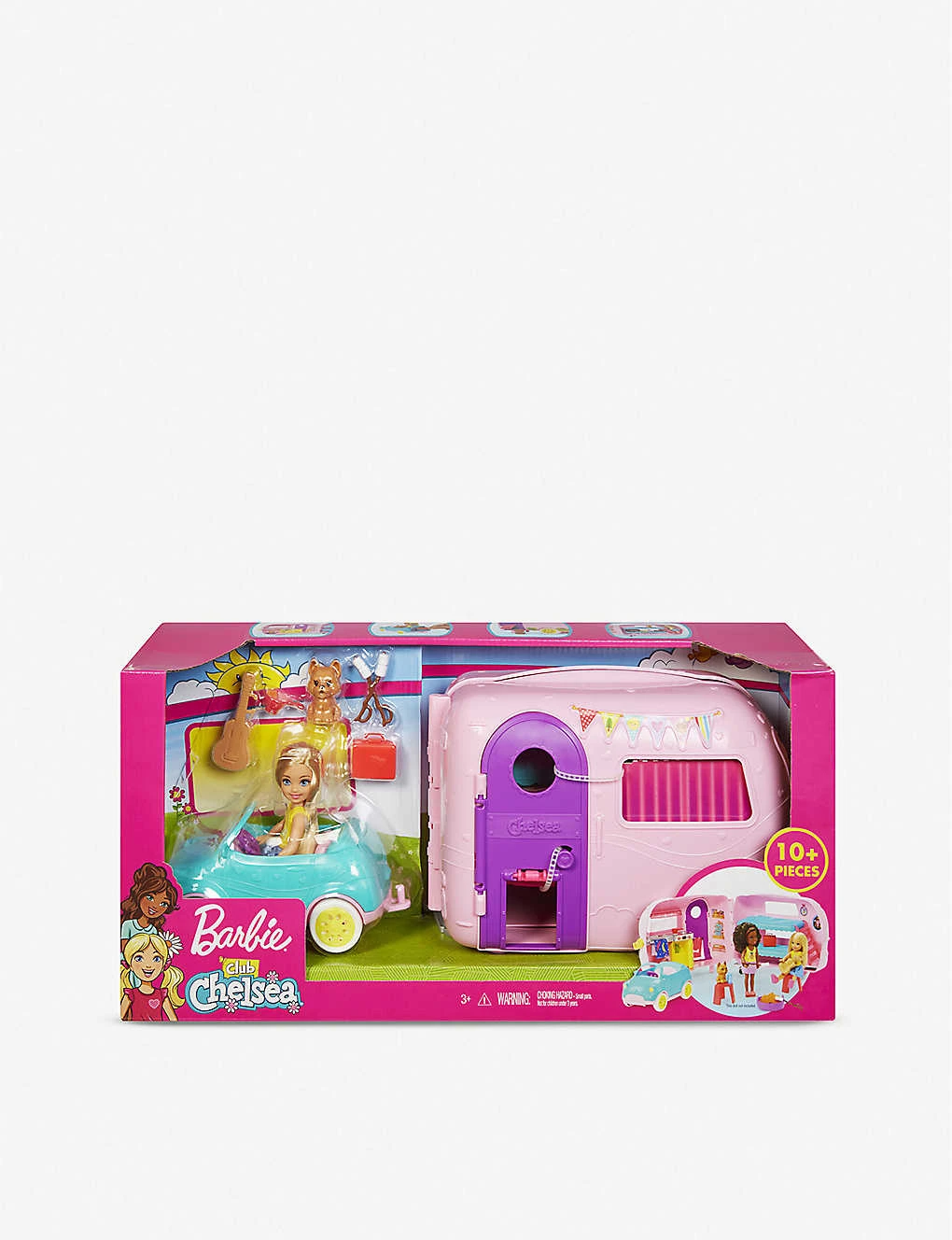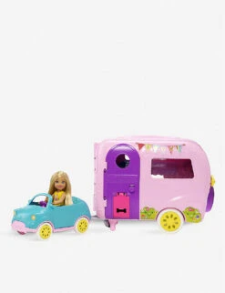 - Includes: x 1 Chelsea doll wearing skirt and shoes, puppy, car, camper, guitar, fire pit, 2 stools, 2 sticks with marshmallows, 2 drinks, 1 pot, 1 towel, 1 blanket and 1 suitcase