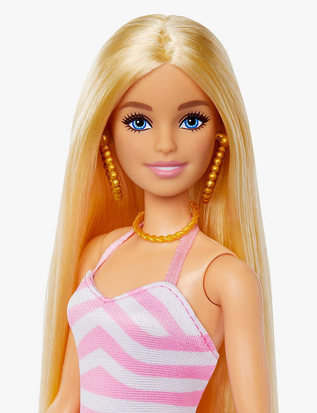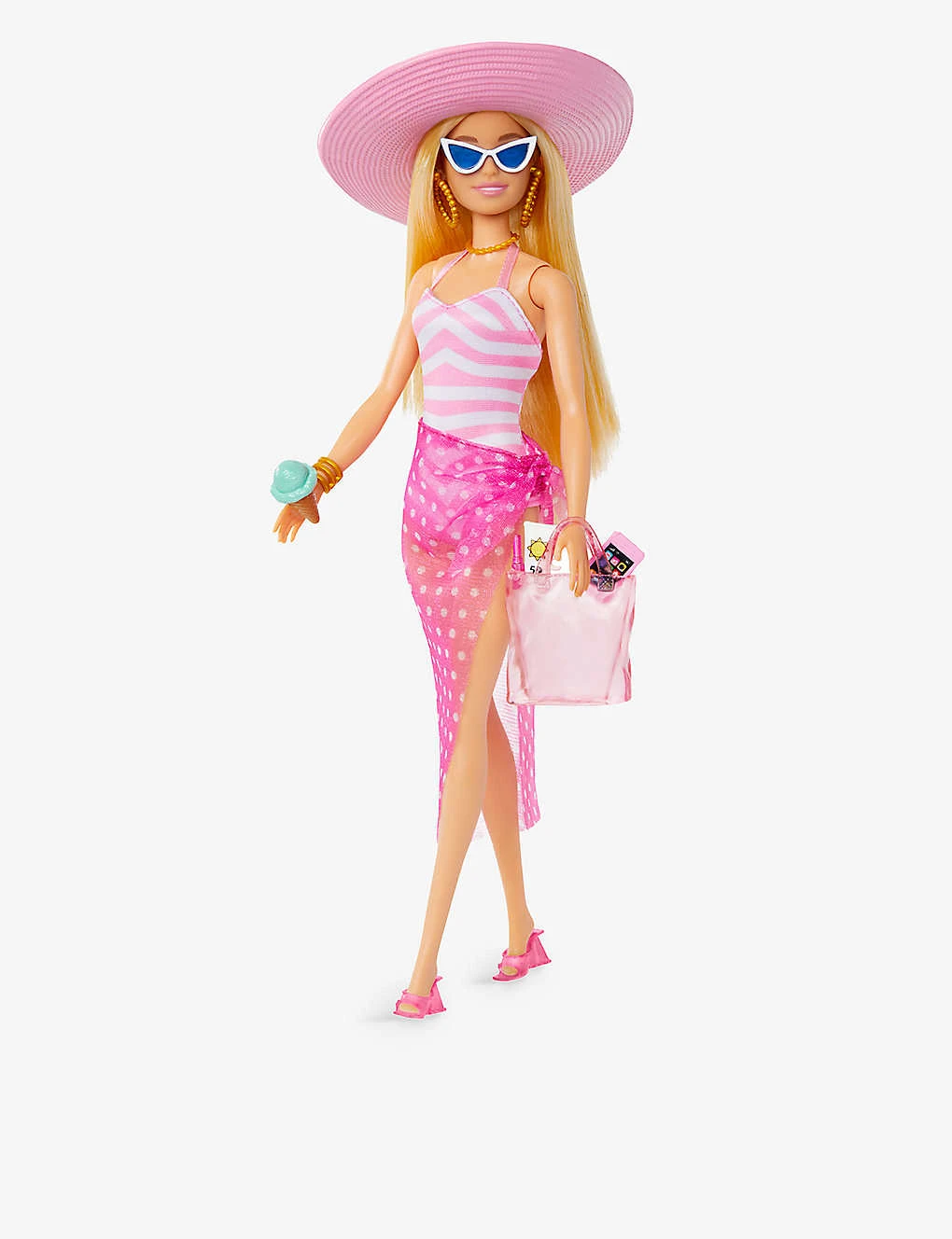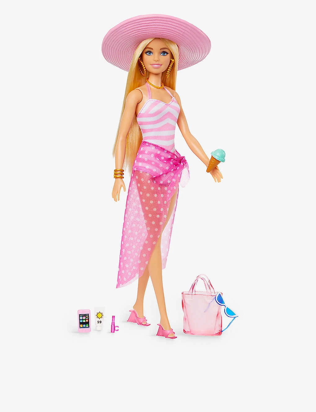- Includes: 1 x Barbie doll with swimsuit, 1 x pair of sandals, 1 x sarong, 1 x hat, 1 x tote bag, assorted small accessories