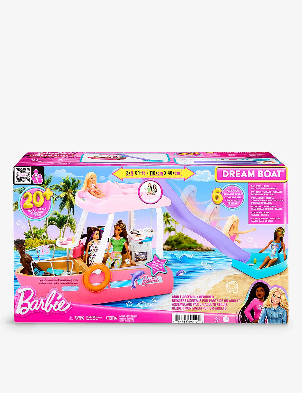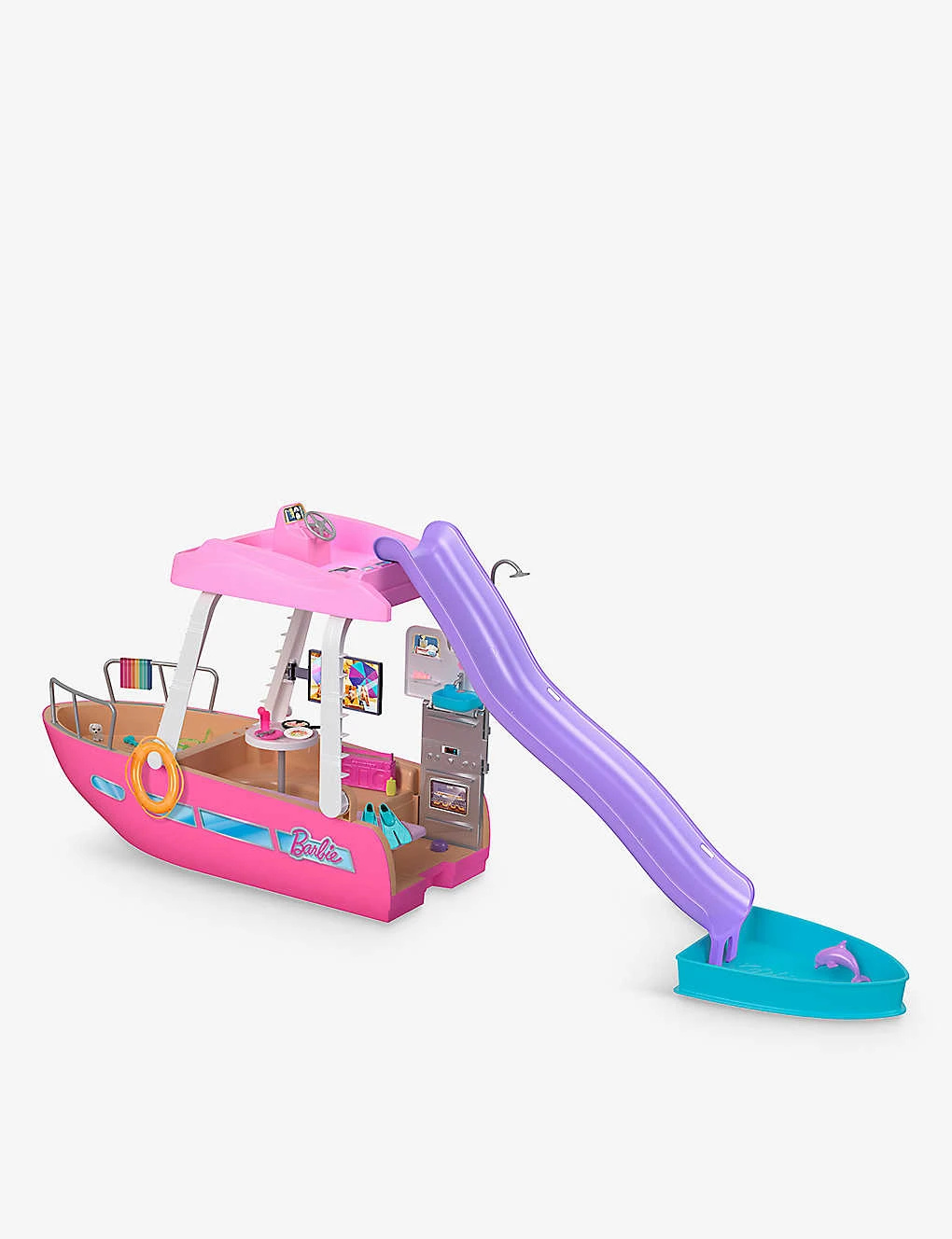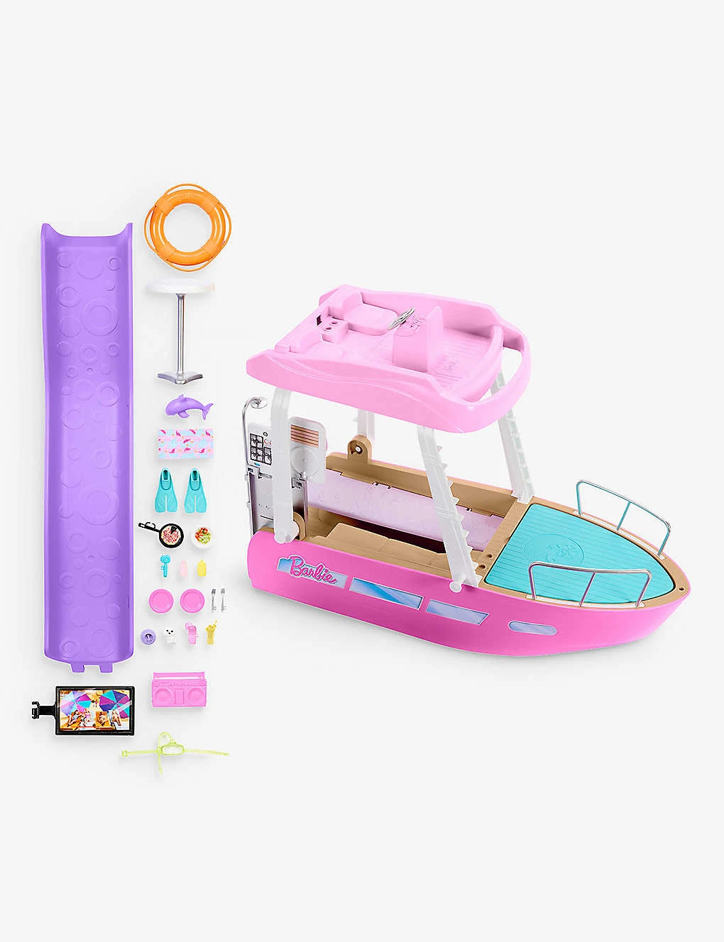- Includes: 1 x Barbie Dream Boat, 1 x slide, 1 x pool, 1 x sun deck, 1 x bathroom, 1 x bedroom, 1 x kitchen, 1 x living room