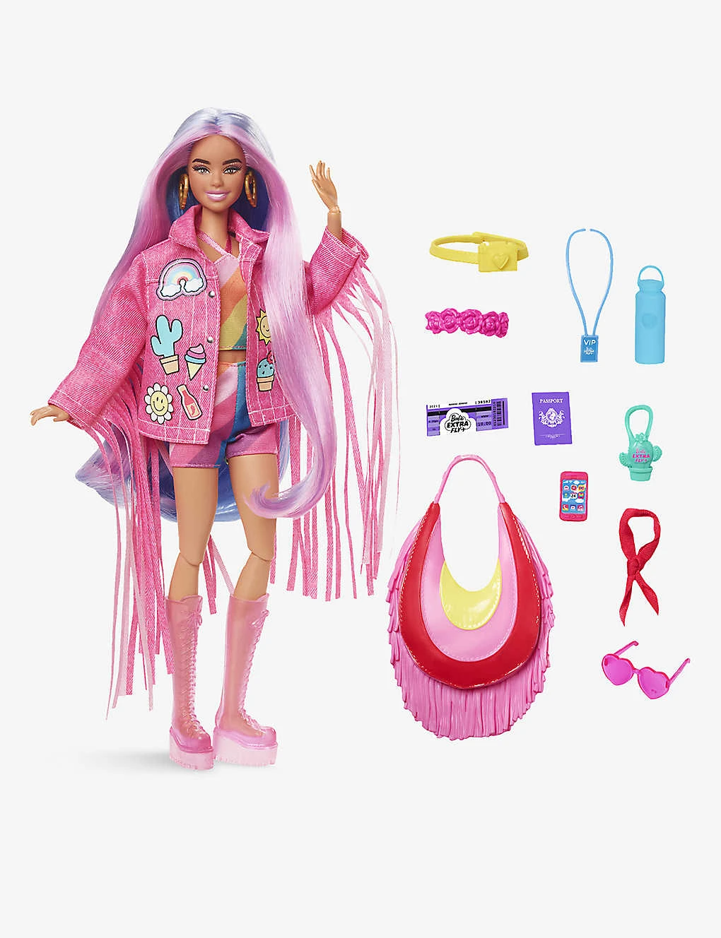 - Includes: 1 x Barbie doll with fashion, 1 x shoes, 1 x pink flower crown, 1 x VIP badge, 1 x heart glasses, 1 x camera belt bag, 1 x oversized bag, 1 x cactus luggage tag, 1 x passport, 1 x plane ticket, 1 x phone, 1 x water bottle