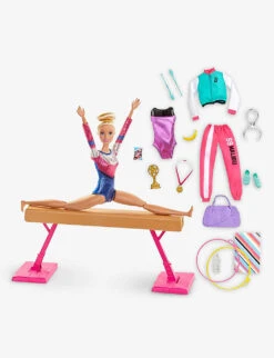- Includes doll, extra leotard, a warmup suit, extra shoes, towel, snacks, gym bag, a balance beam, 2 x rings, spinning clip and 2 x clubs to compete and perform