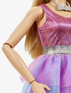 - Includes: 1x doll, 1 x shimmering dress, 1 x logo necklace, 1 x hair clip, 1 x platform trainers