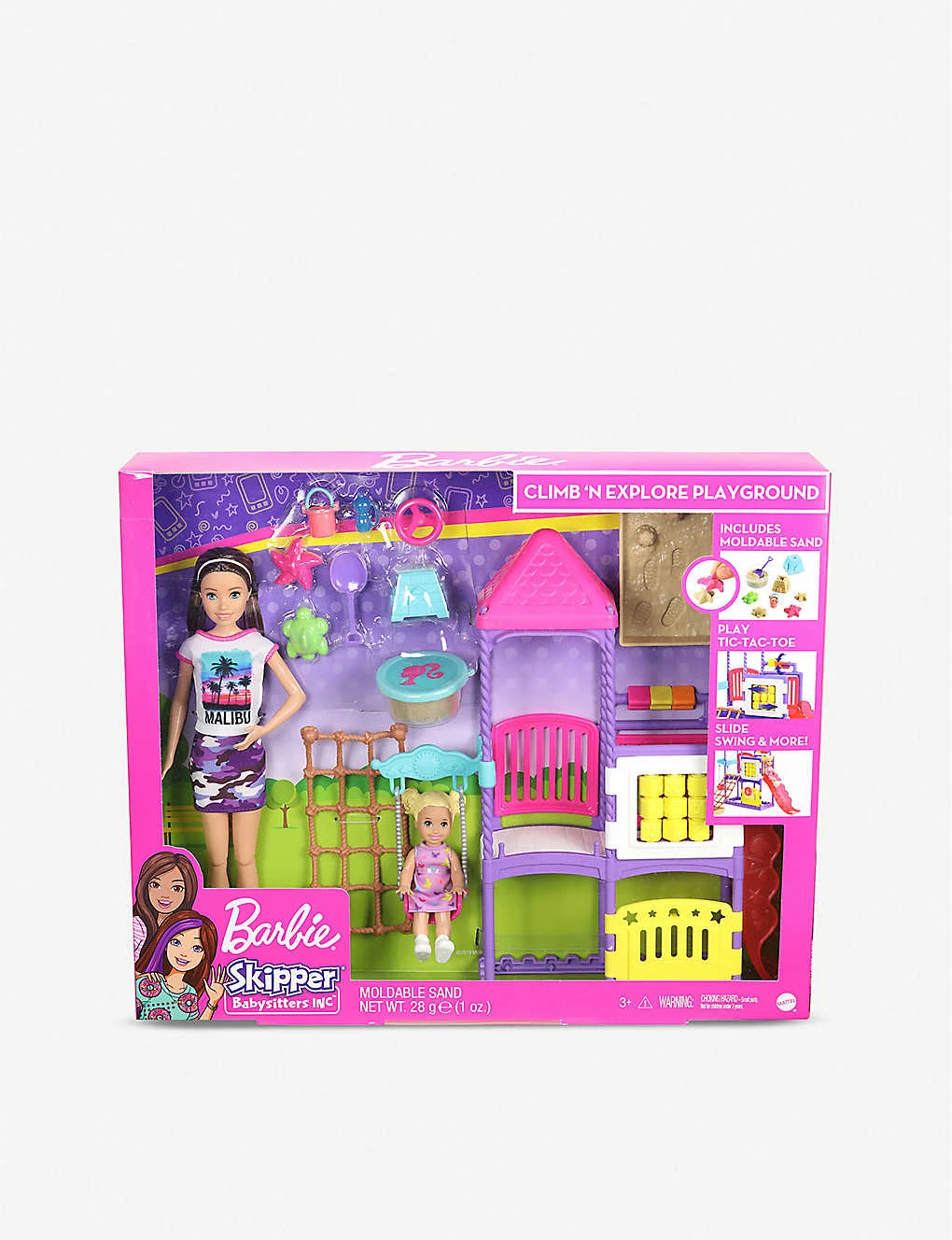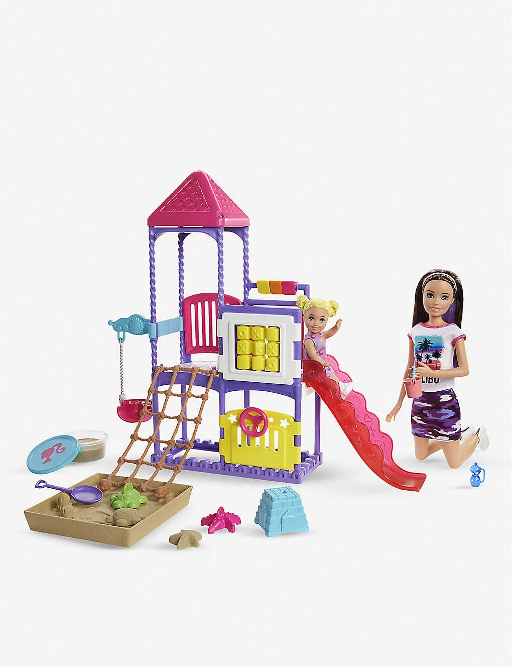 - Includes:1 x Skipper babysitter doll wearing fashions and shoes, 1 x small toddler doll wearing fashion and shoes, playground station with sandbox, one container of mouldable sand, a shovel, three moulds and accessories