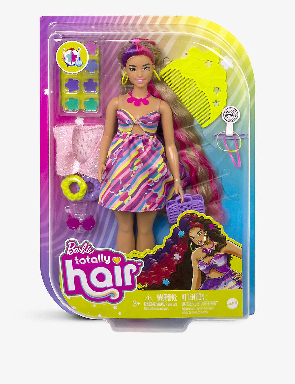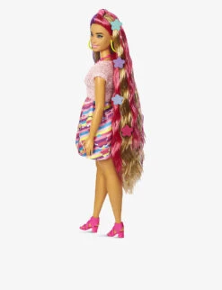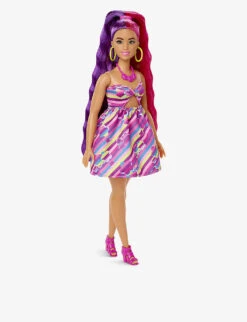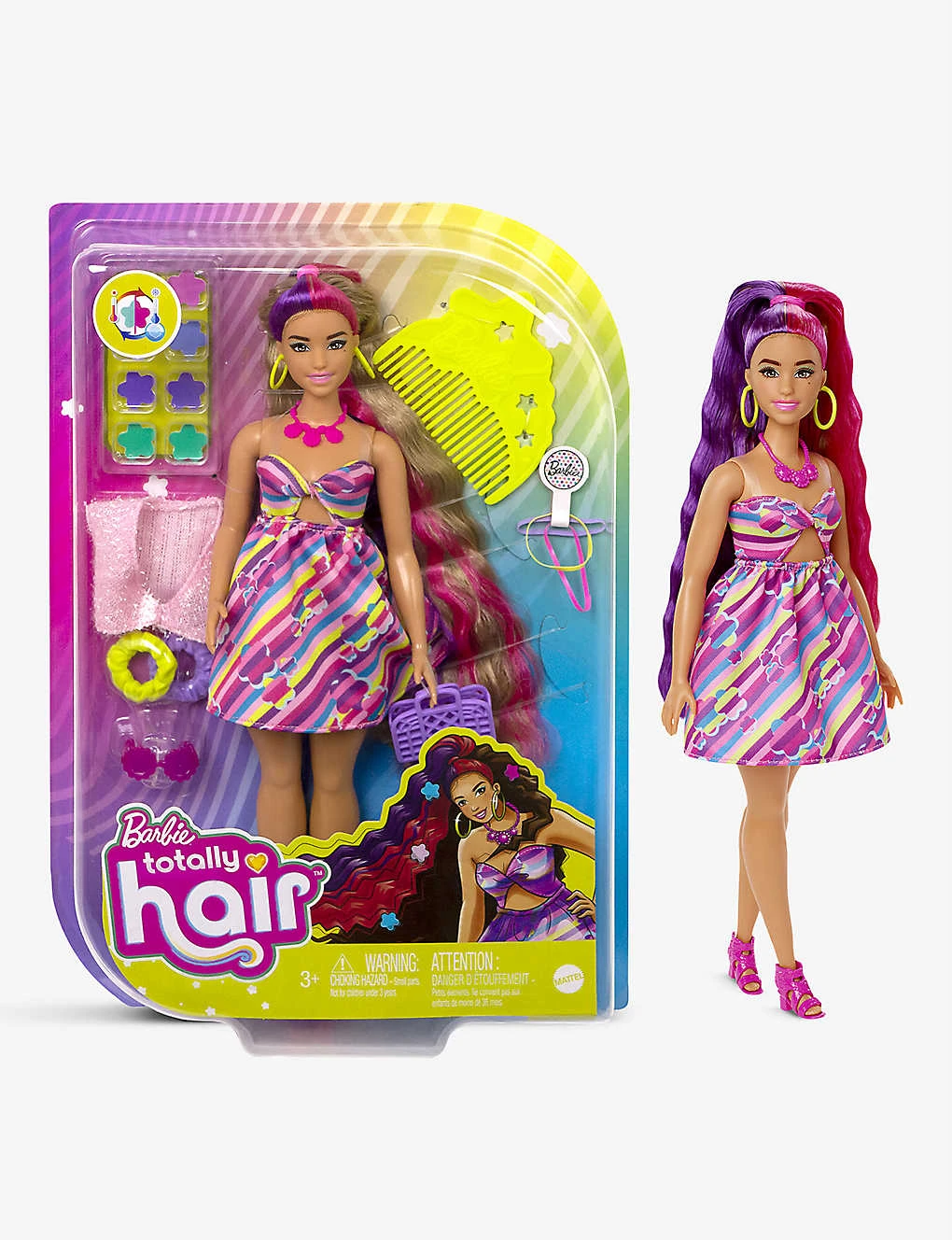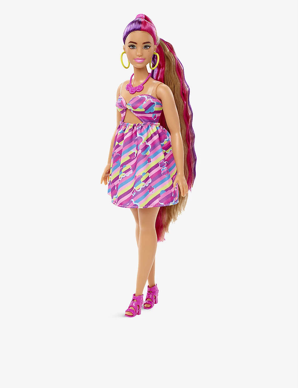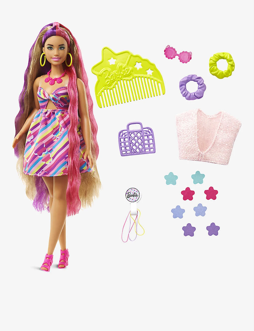 - Includes: 1 Barbie doll, 8 colour change hair clips, 1 comb, 1 set of hair ties, 2 scrunchies, 1 metallic cropped sweater, 1 purse, 1 pair of sunglasses, 1 necklace