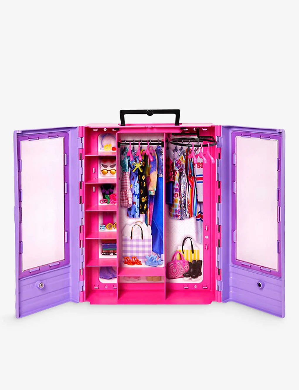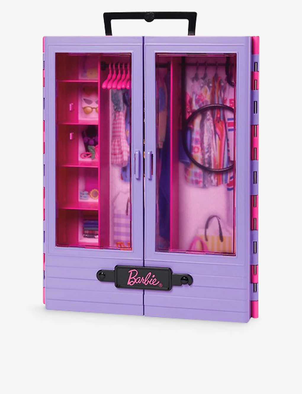 - Carrying handle, six hangers included, fold-out rack, translucent doors (doll, fashions and accessories not included)