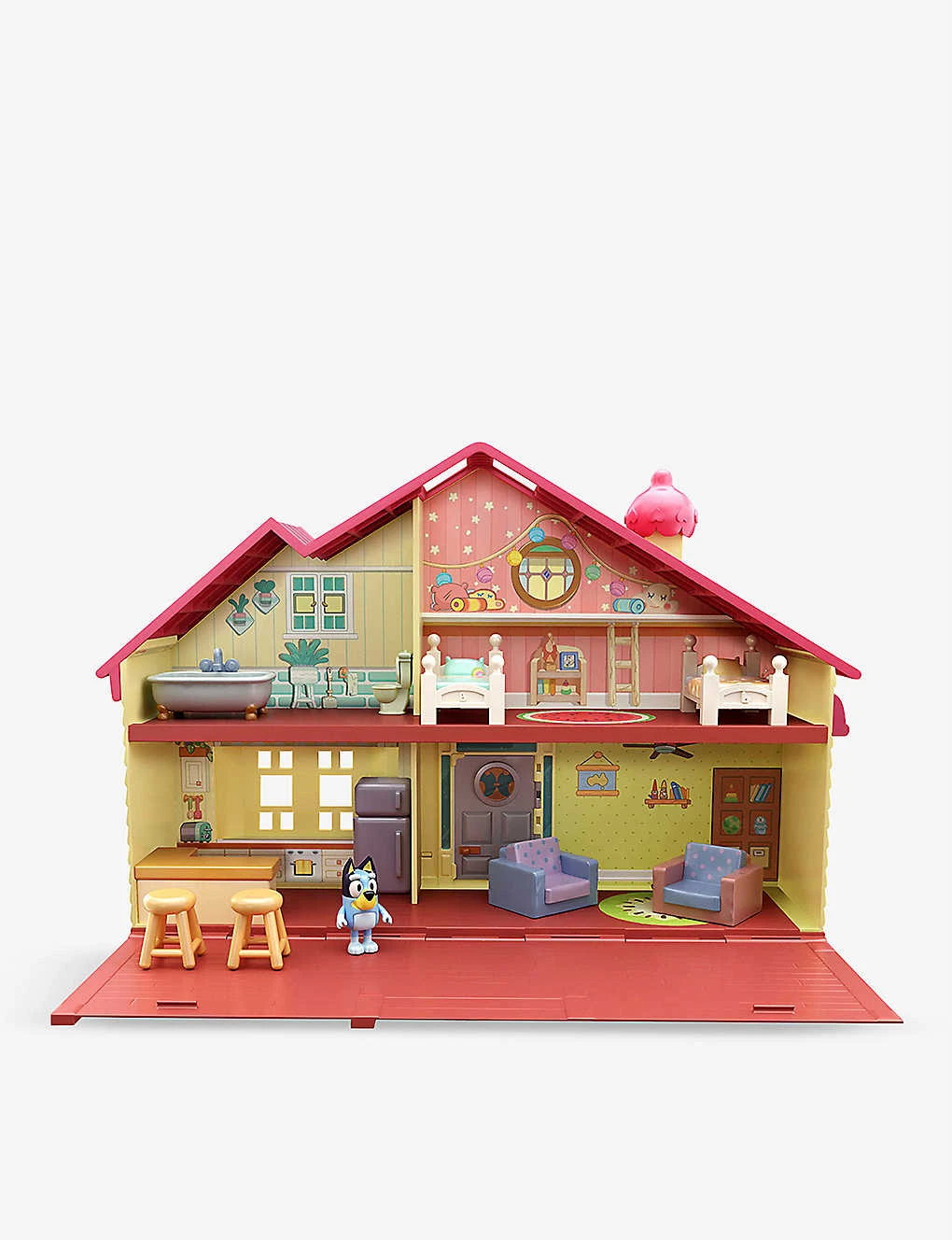 - Includes: 1x house, 1x Bluey figure, 2x beds, 2x stools, 2x sofas, 2x rugs, 1x bathtub, 1x toilet, 1x dining room counter, 1x fridge