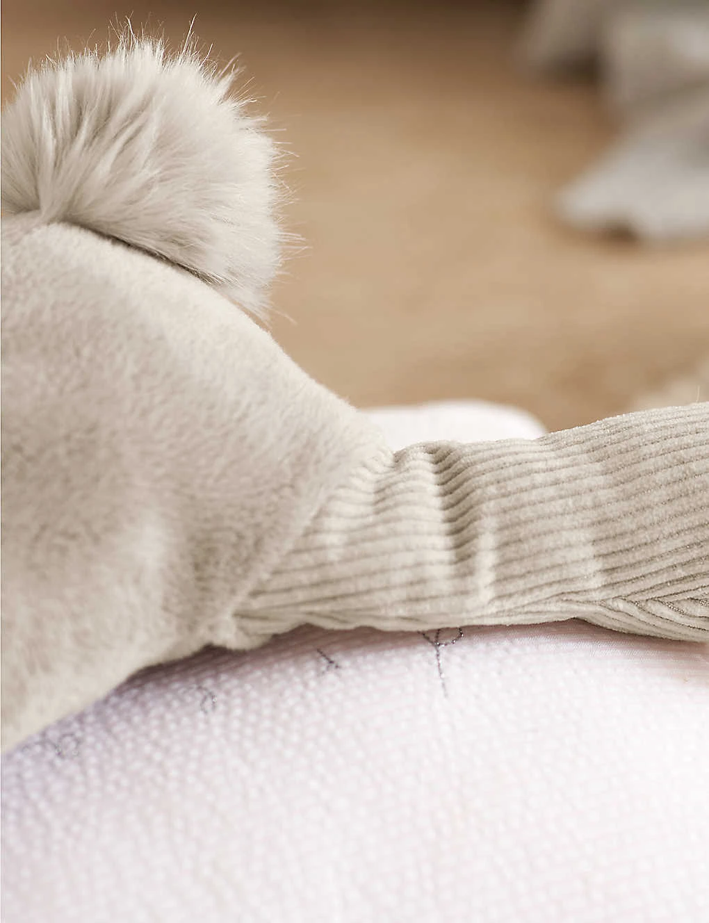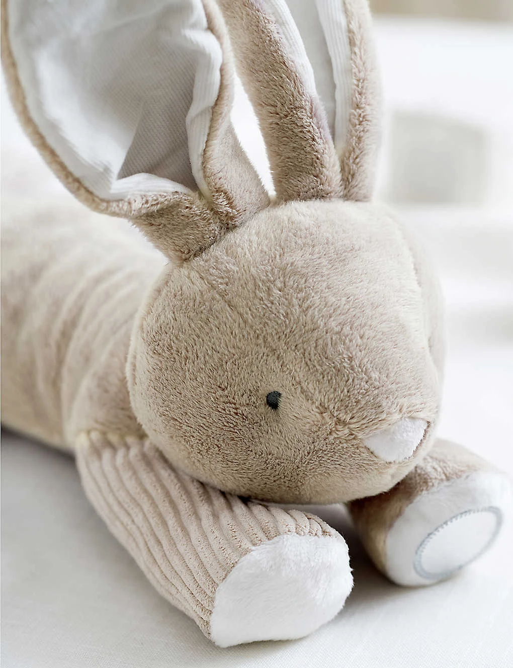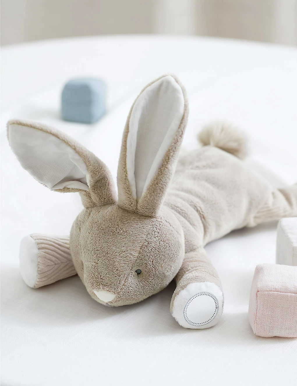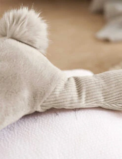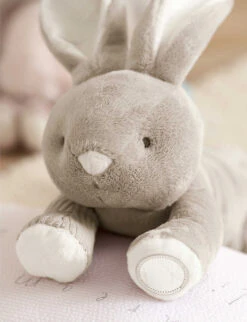 - Faux fur bunny, soft cord textures, 3D legs and arms, crinkles, squeaks, rattles, mirror