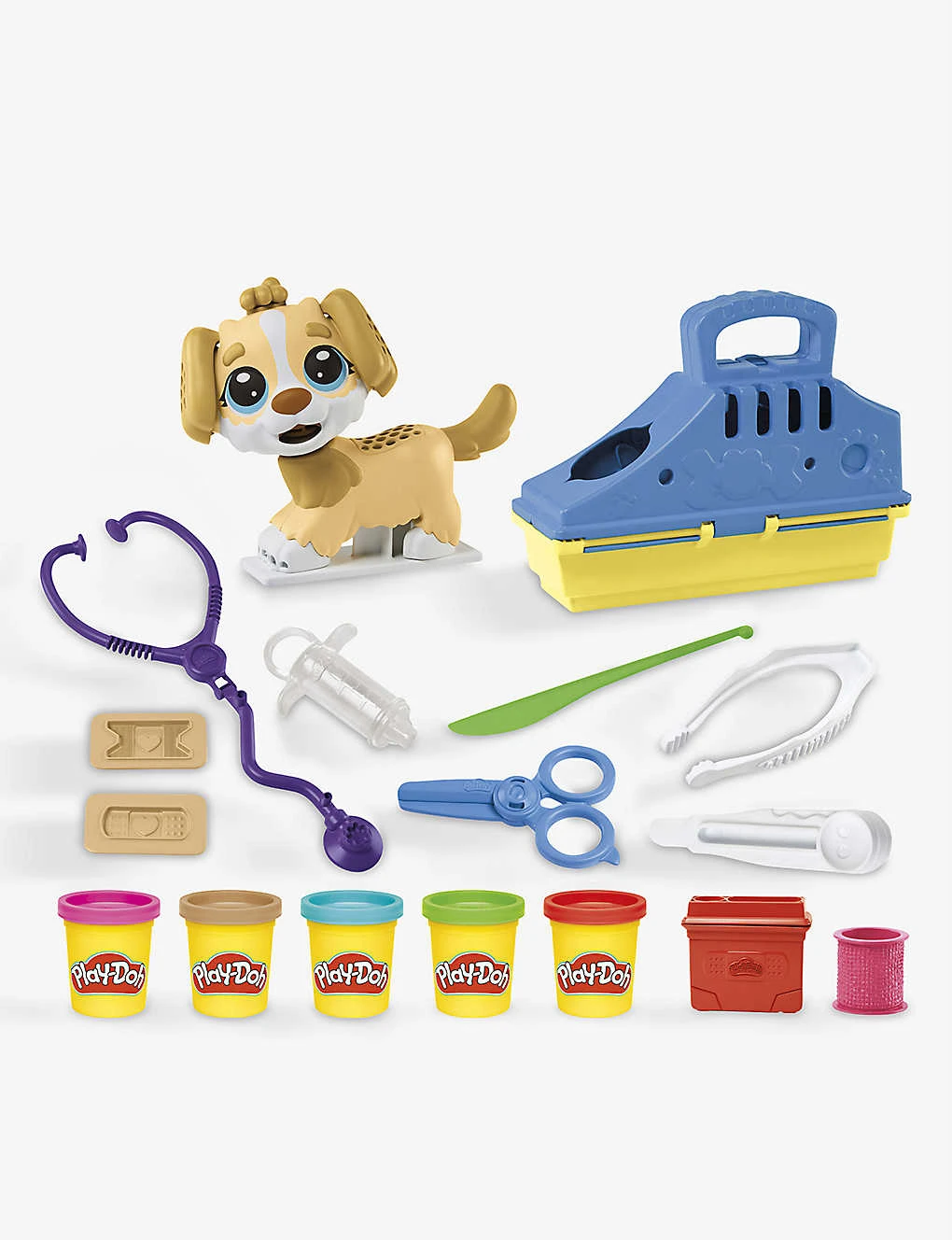 - Icludes: 5 Play-Doh cans, 10 vet-themed tools, carrier