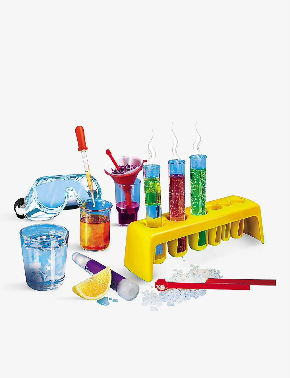 - Includes: 1 x safety goggles, 3 x beakers and lids, 3 x test tubes and stoppers, 1 x test tube safety key, 1 x stirrer, 1 x pipette, 1 x bottle brush, 1 x funnel, 1 x test tube rack, 1 x spatula, 1 x filter paper, 1 x tweezers and instruction manual; chemical substances: copper sulphate, tartaric acid, bleeding universal indicator paper; more than 80 activities and experiments, 150-piece jigsaw puzzle of the periodic table