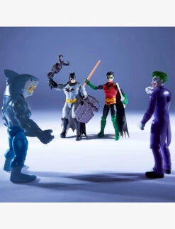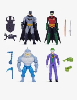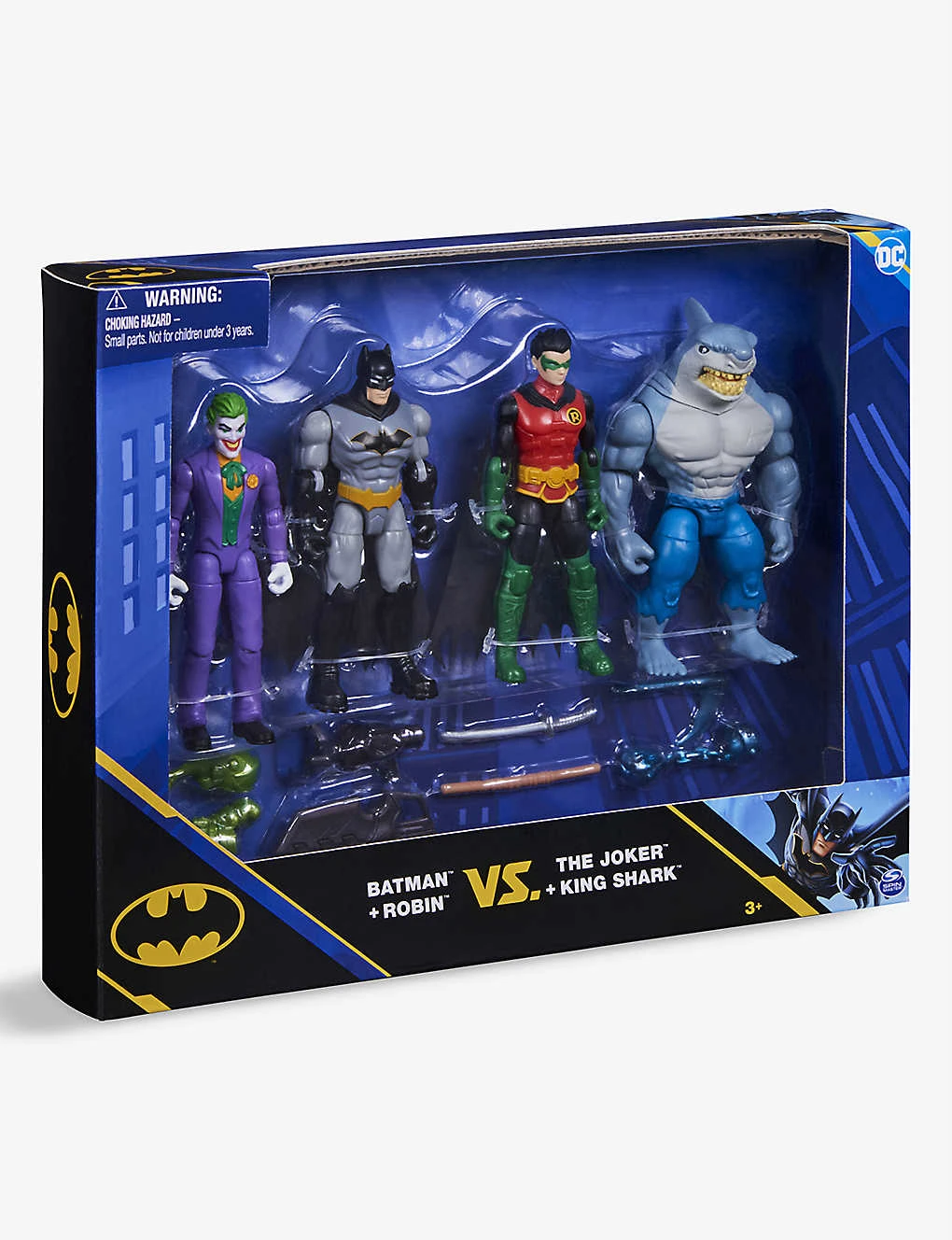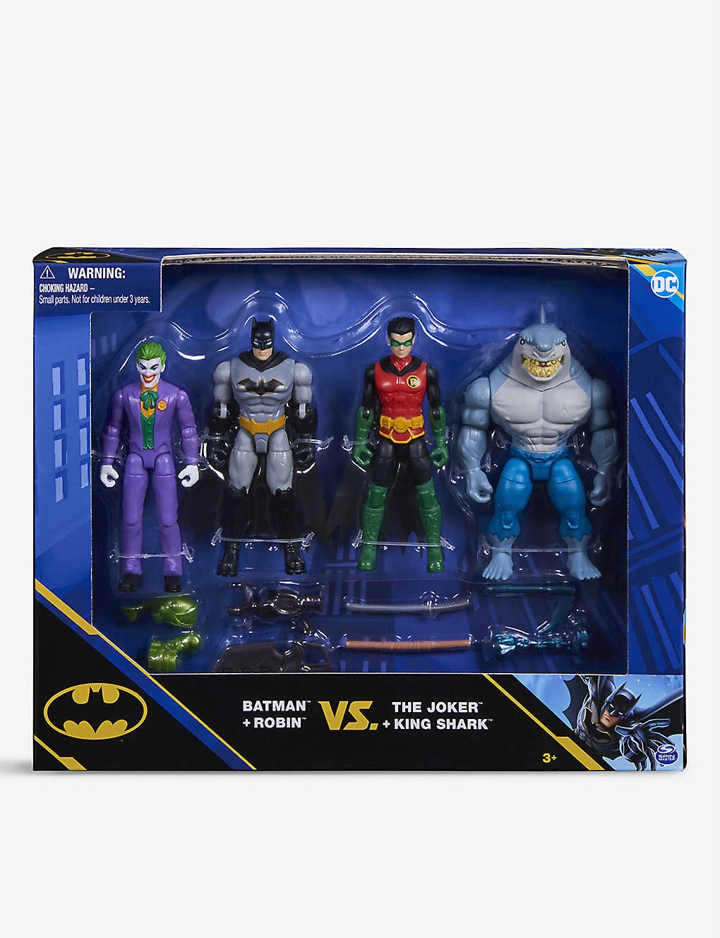 - Includes: 1 x Batman figure, 1 x Robin figure, 1 x The Joker figure, 1 x King Shark figure, 4 x accessories