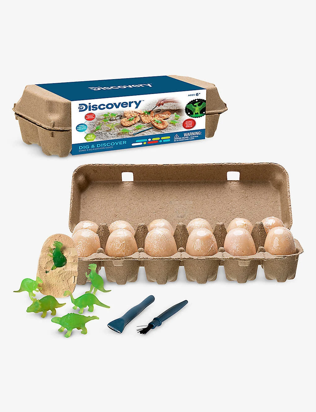 - 12 eggs, glow-in-the-dark dinosaur figure in each one, excavation tools,