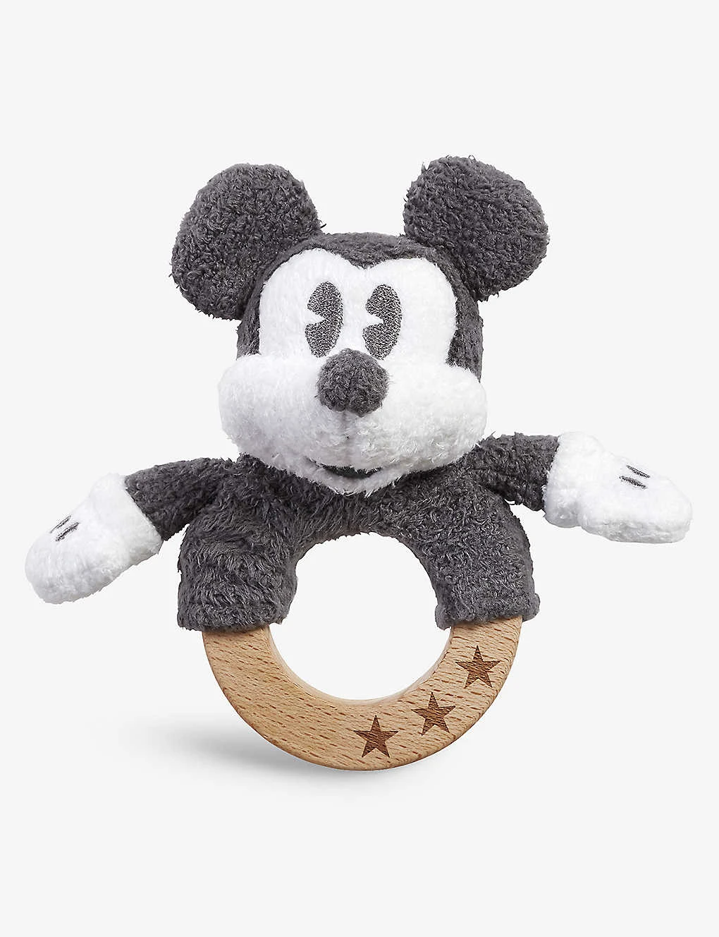 - Mickey Mouse Memories collection, rattle charm, wooden ring, star print on handle, multiple textures, tonal stitching