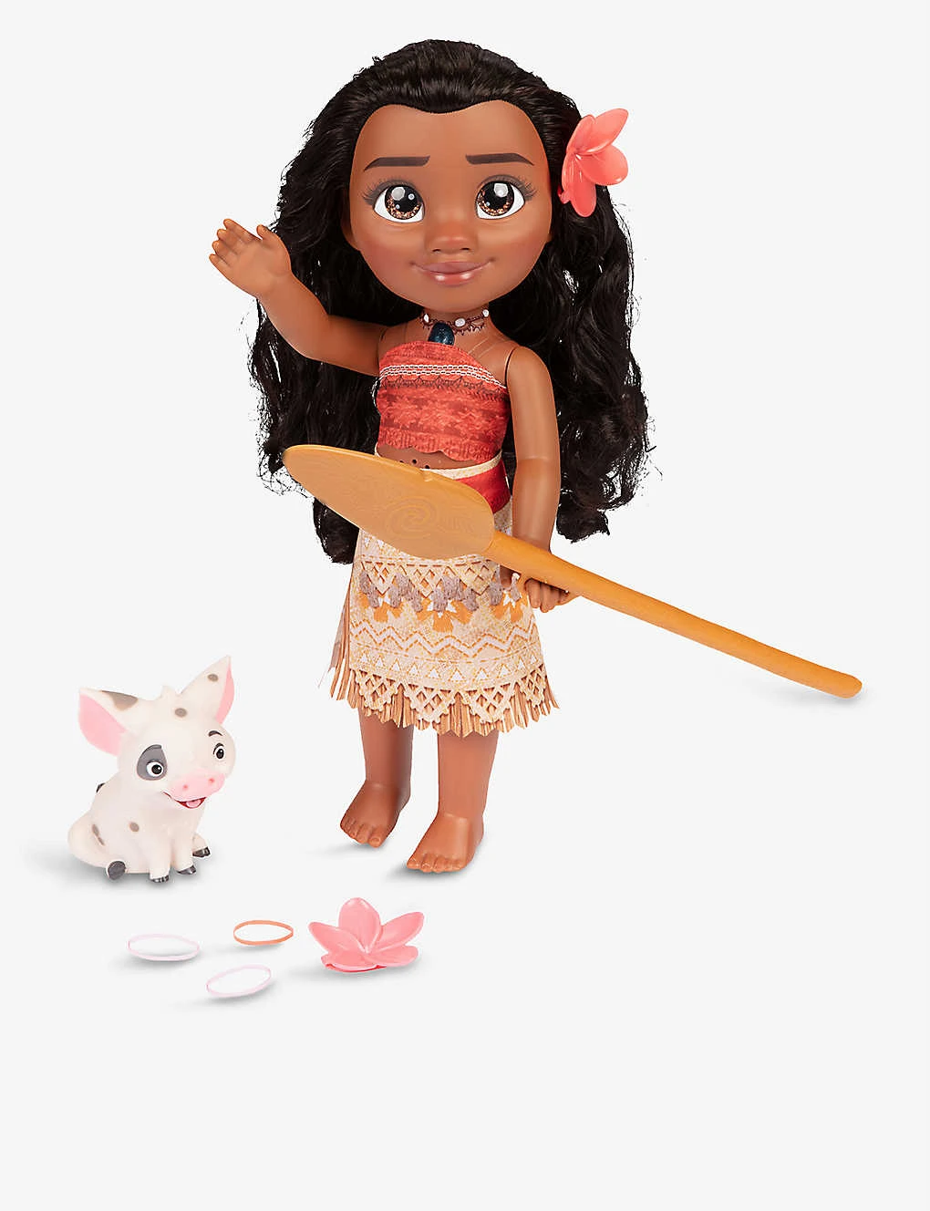 - Includes: 1 Moana doll, 1 doll outfit, 1 doll oar, 2 flower hairclips, 3 elastic bands, 1 Pua figure