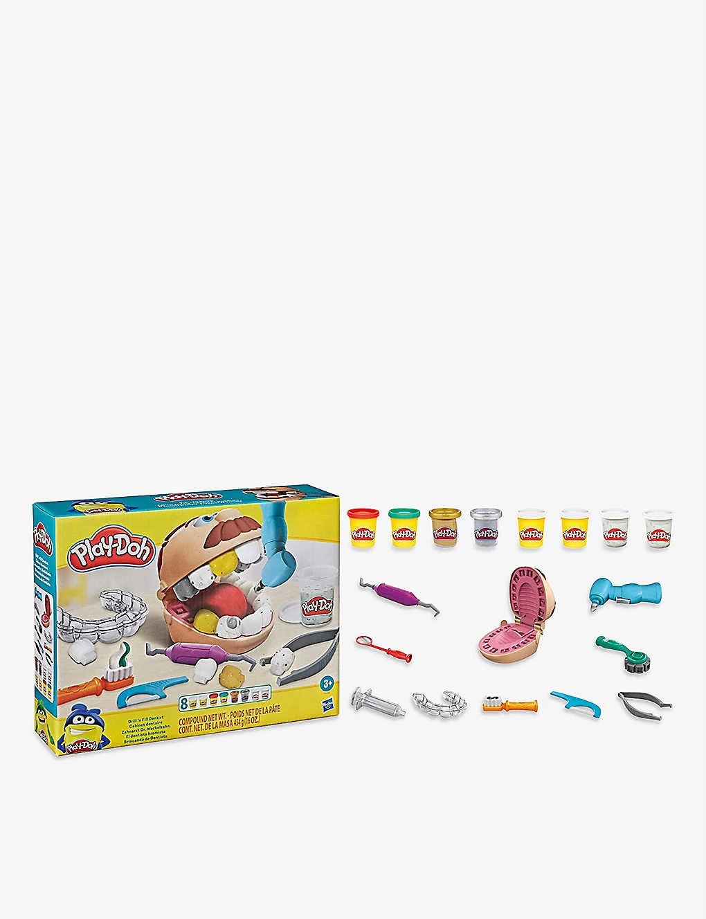 - Includes: 1 x dentist moulds, 1 x patient mouth, 8 x playdoh tubs, 1 x large drill, 6 x medium tools, 1 x instruction manual