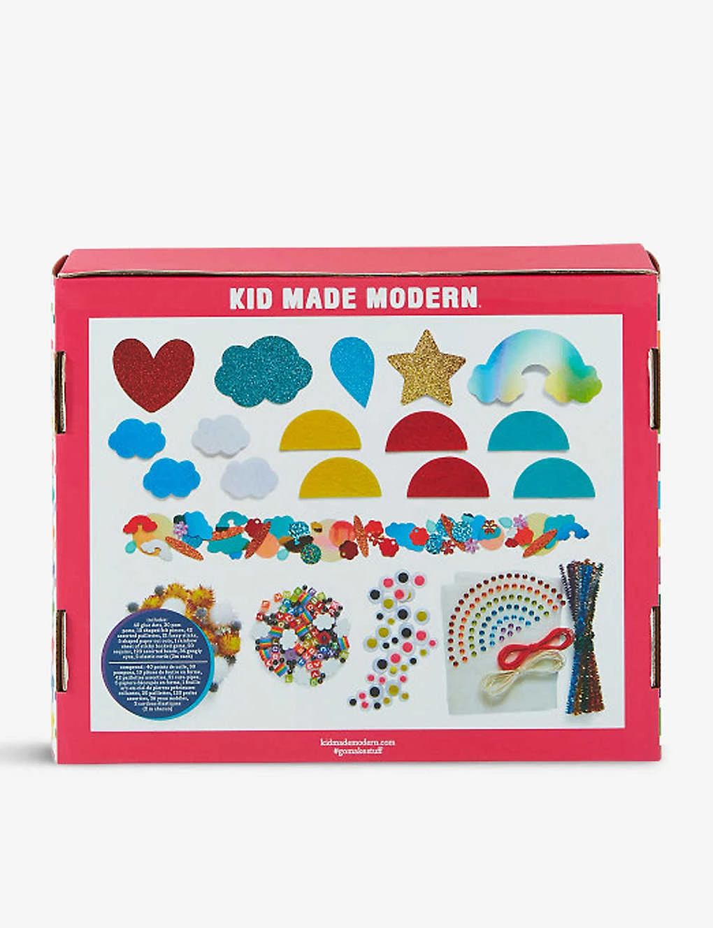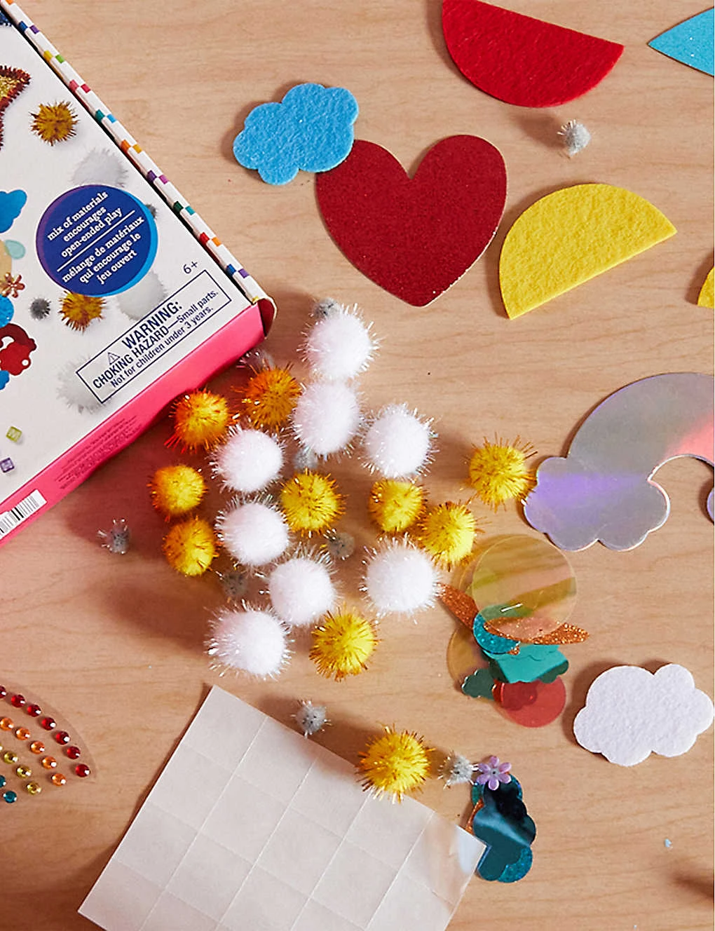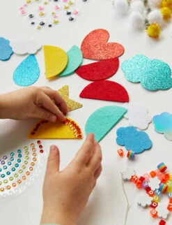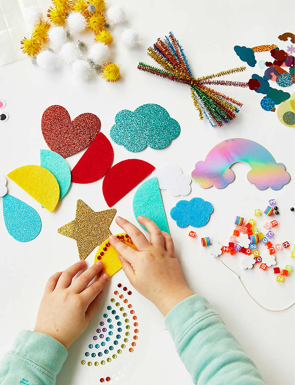 - Includes: 40 glue dots, 30 pom poms, 10 shaped felt pieces, 42 assorted paillettes, 21 fuzzy sticks, 5 shaped paper cut outs, 1 rainbow sheet of sticky backed gems, 20 sequins, 120 assorted beads, 36 googly eyes, 2 elastic cords (2m each)