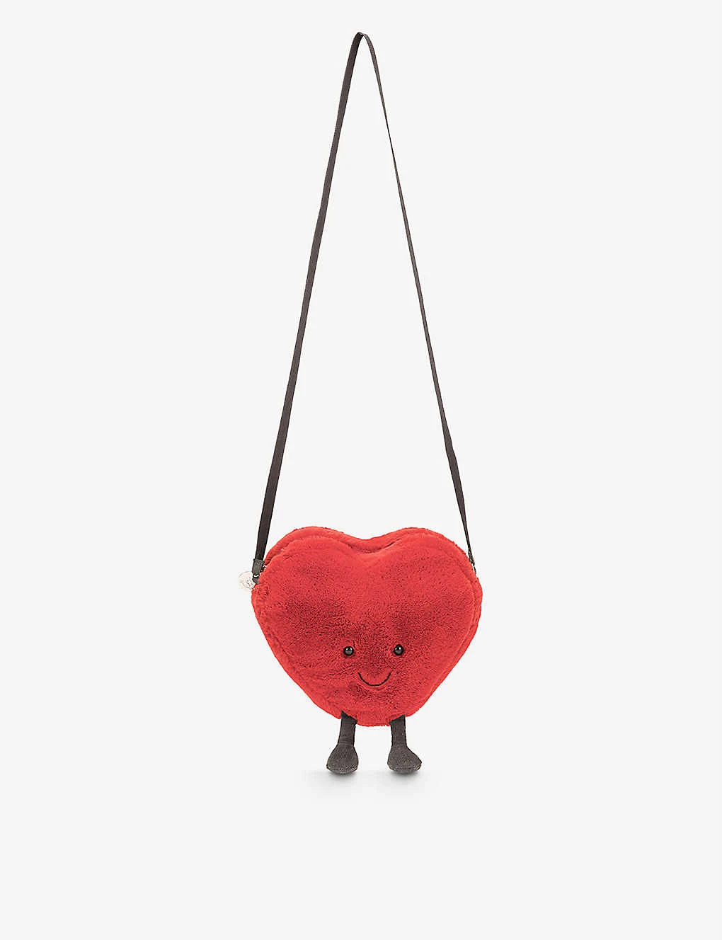 - Shoulder strap, zip fastening, red heart with feet, embroidered face, bead eyes