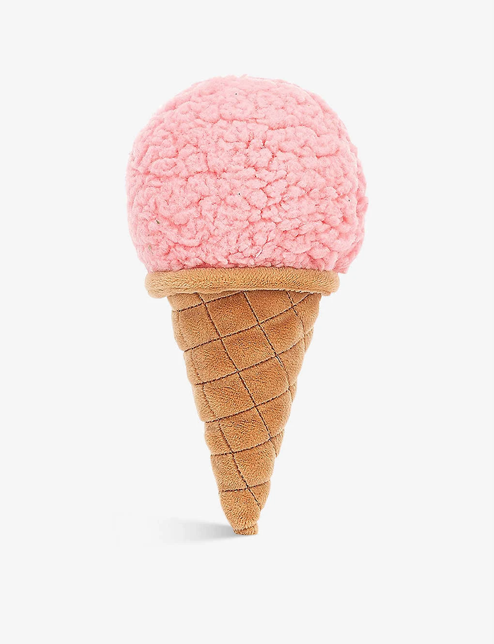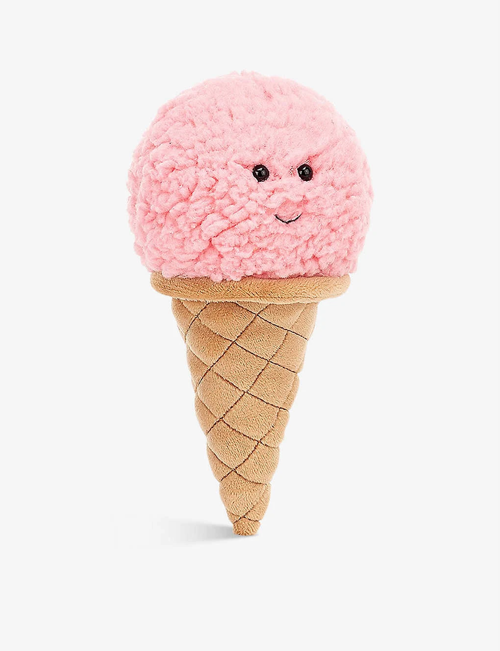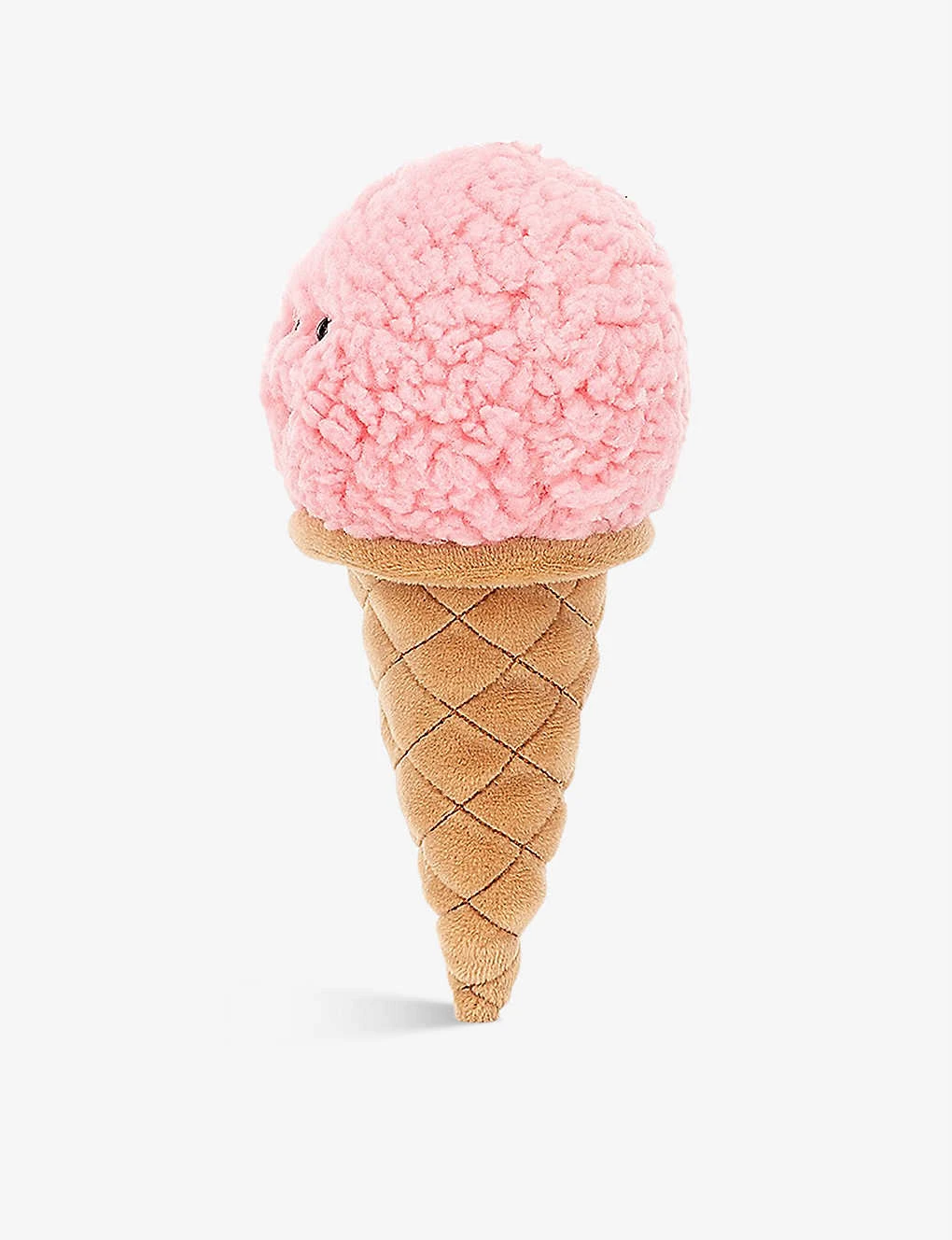 - Suede-feel waffle cone, fluffy “”ice-cream ball””, embroidered smile, glossy eyes