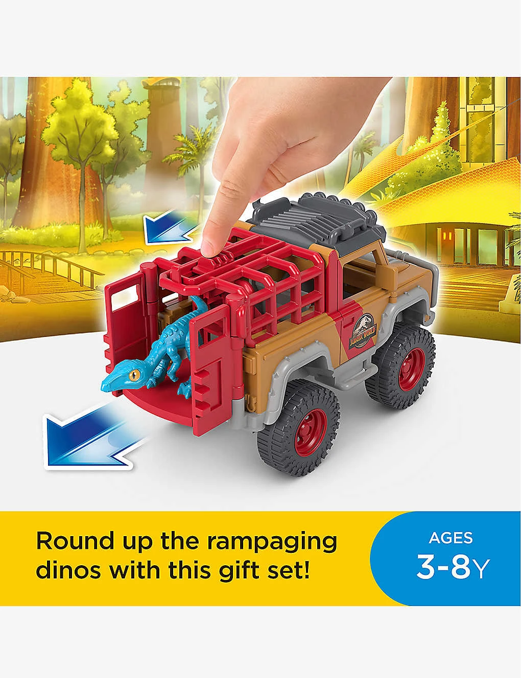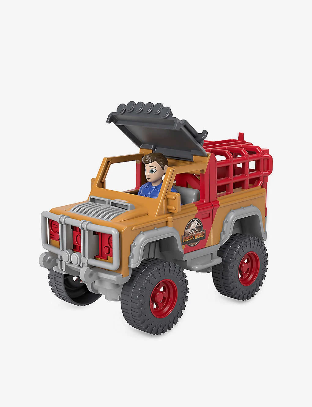 - Press-button on dinosaur moves head, branding on side of car, posable limbs, open and close cage at back of car, spinning wheels