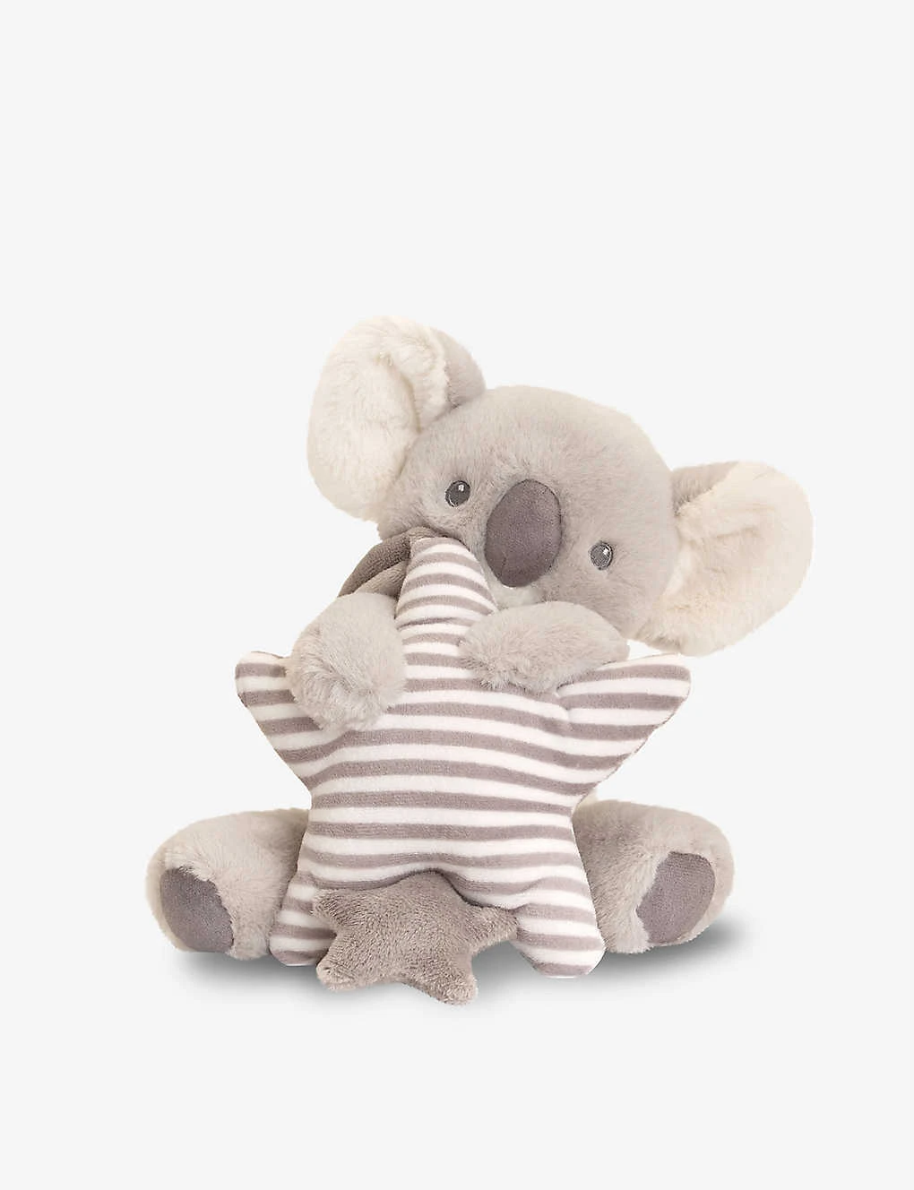 - Sitting koala design, embroidered eyes, holding a striped star, musical toy, pull cord at back