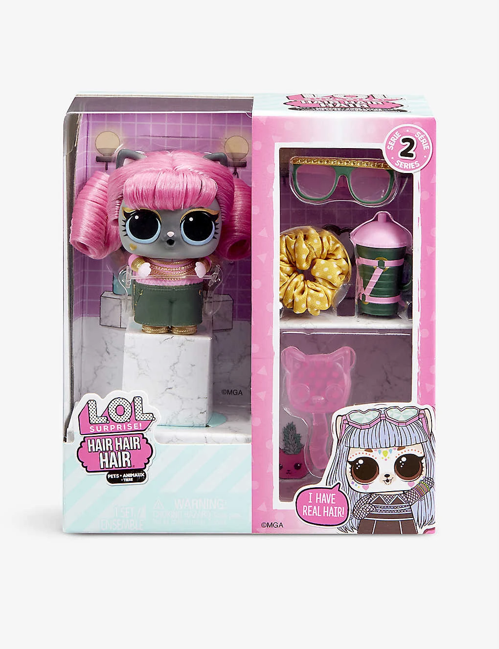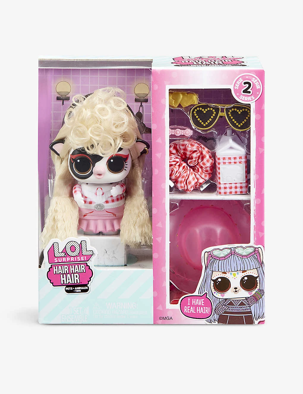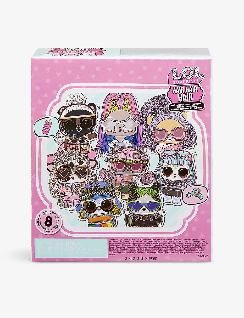 - Includes: 10 surprises including a L.O.L. Surprise! Hair Hair Hair Pet, Costume, Shoes, Glasses, Bottle, Brush, Hair Accessory, Scrunchie, Accessory and Rubber Bands