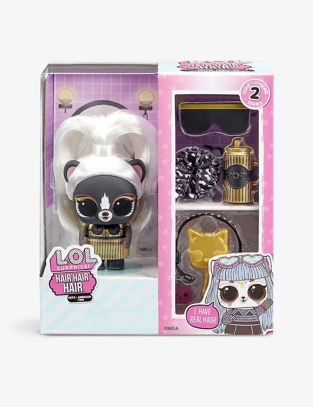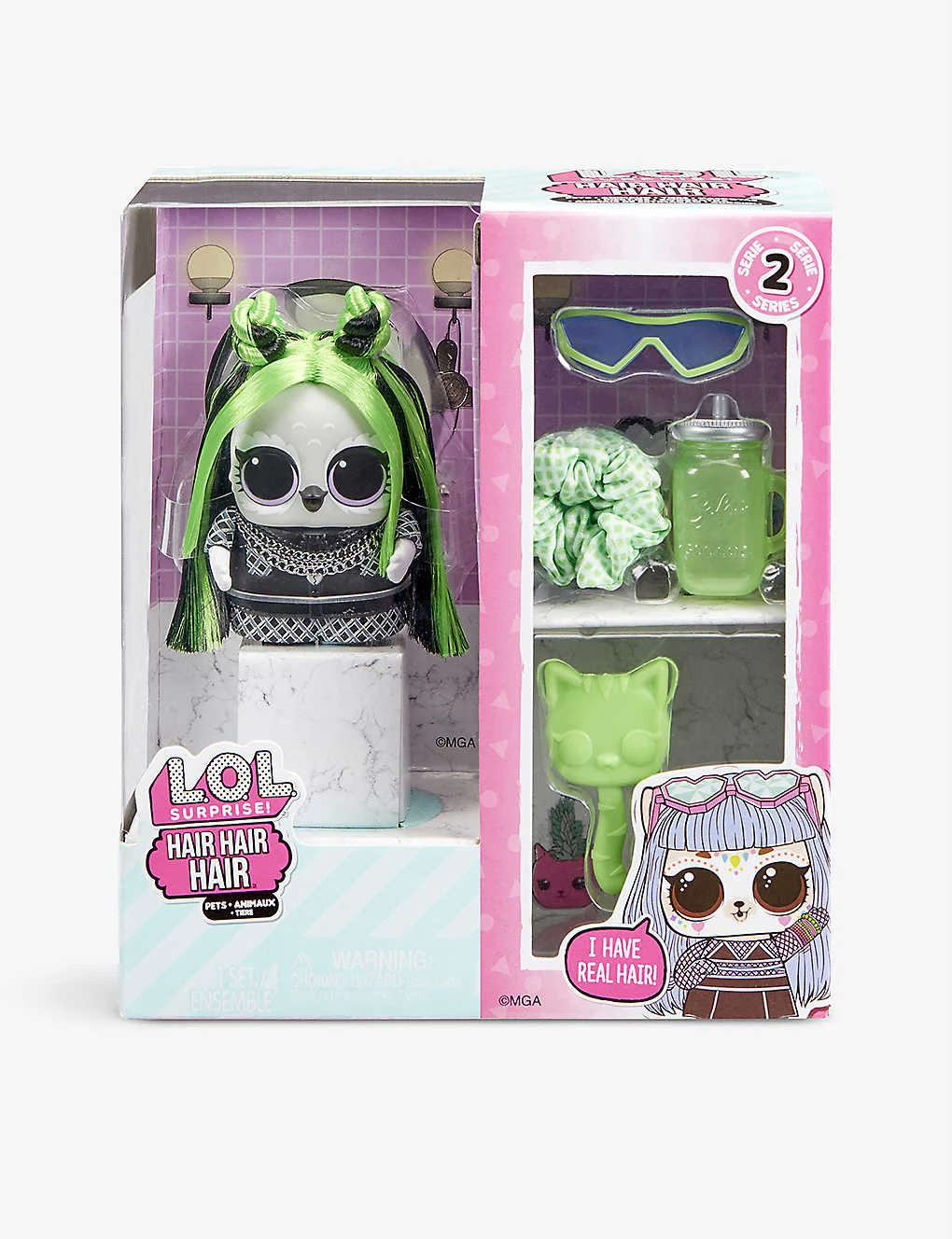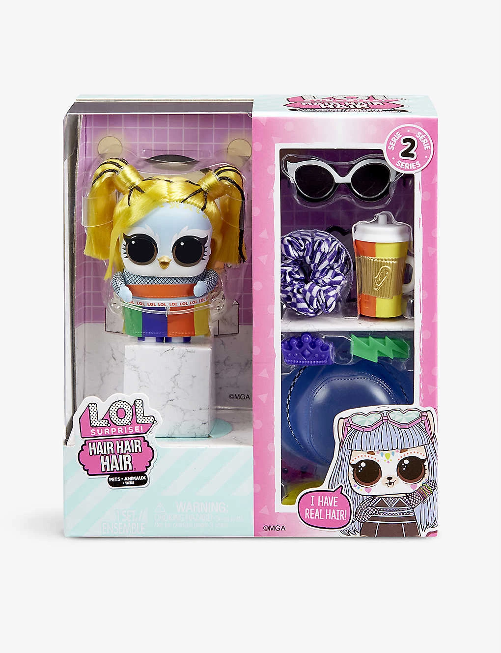 - Includes: 10 surprises including a L.O.L. Surprise! Hair Hair Hair Pet, Costume, Shoes, Glasses, Bottle, Brush, Hair Accessory, Scrunchie, Accessory and Rubber Bands