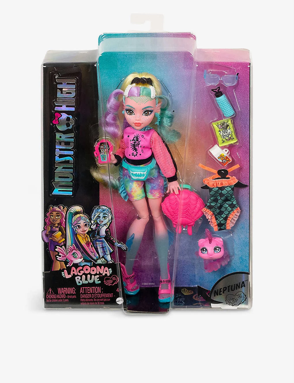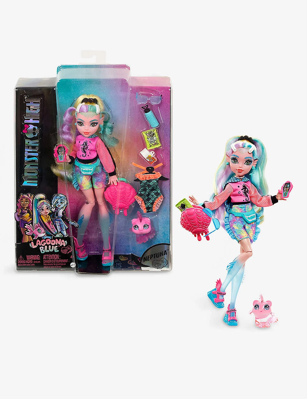 Contains: one Lagoona Blue doll, one outfit, one pair of shoes, one swimsuit, one pet figure, one backpack, two snacks, one water bottle, one toy smartphone accessories