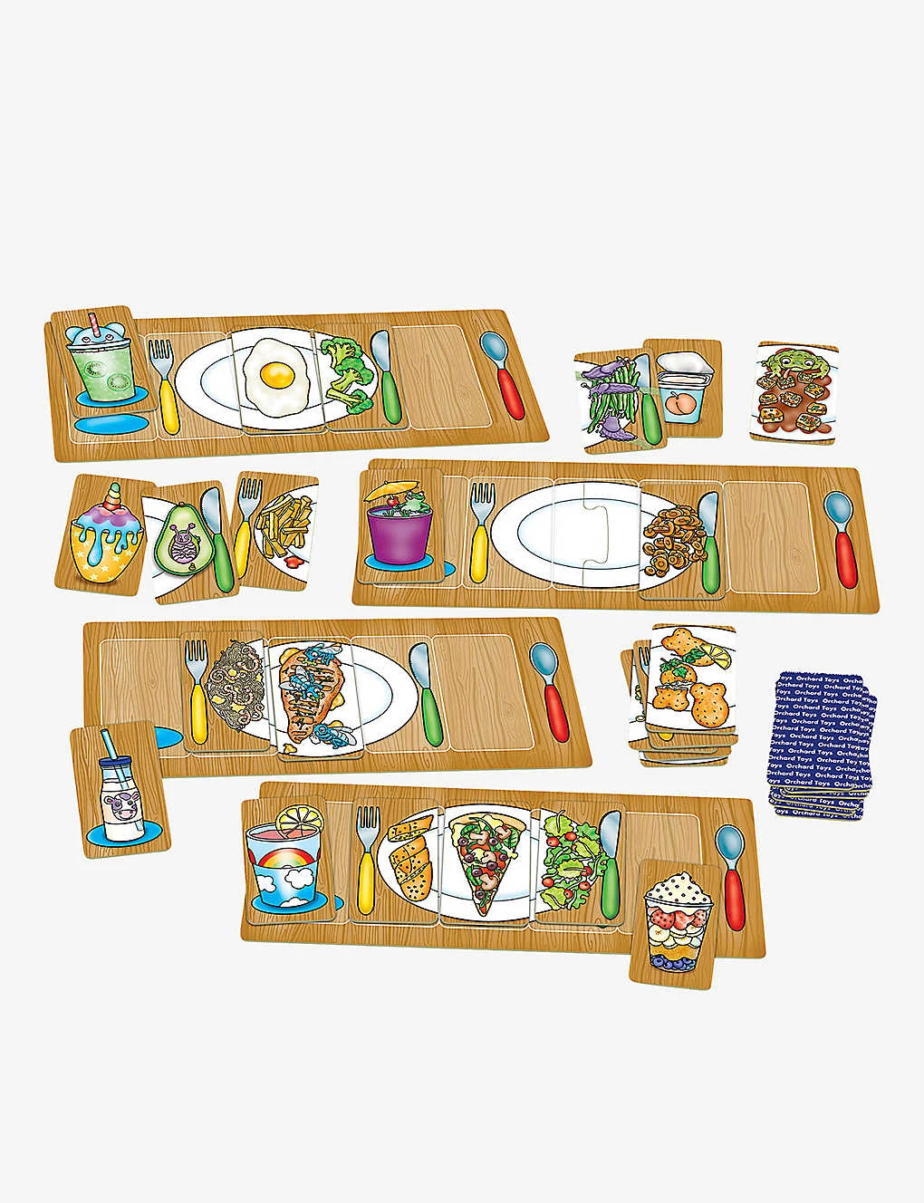 - Four place setting boards, 20 food cards, 10 Tummy Ache cards, instruction leaflet