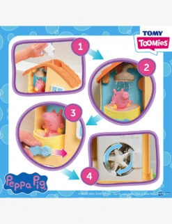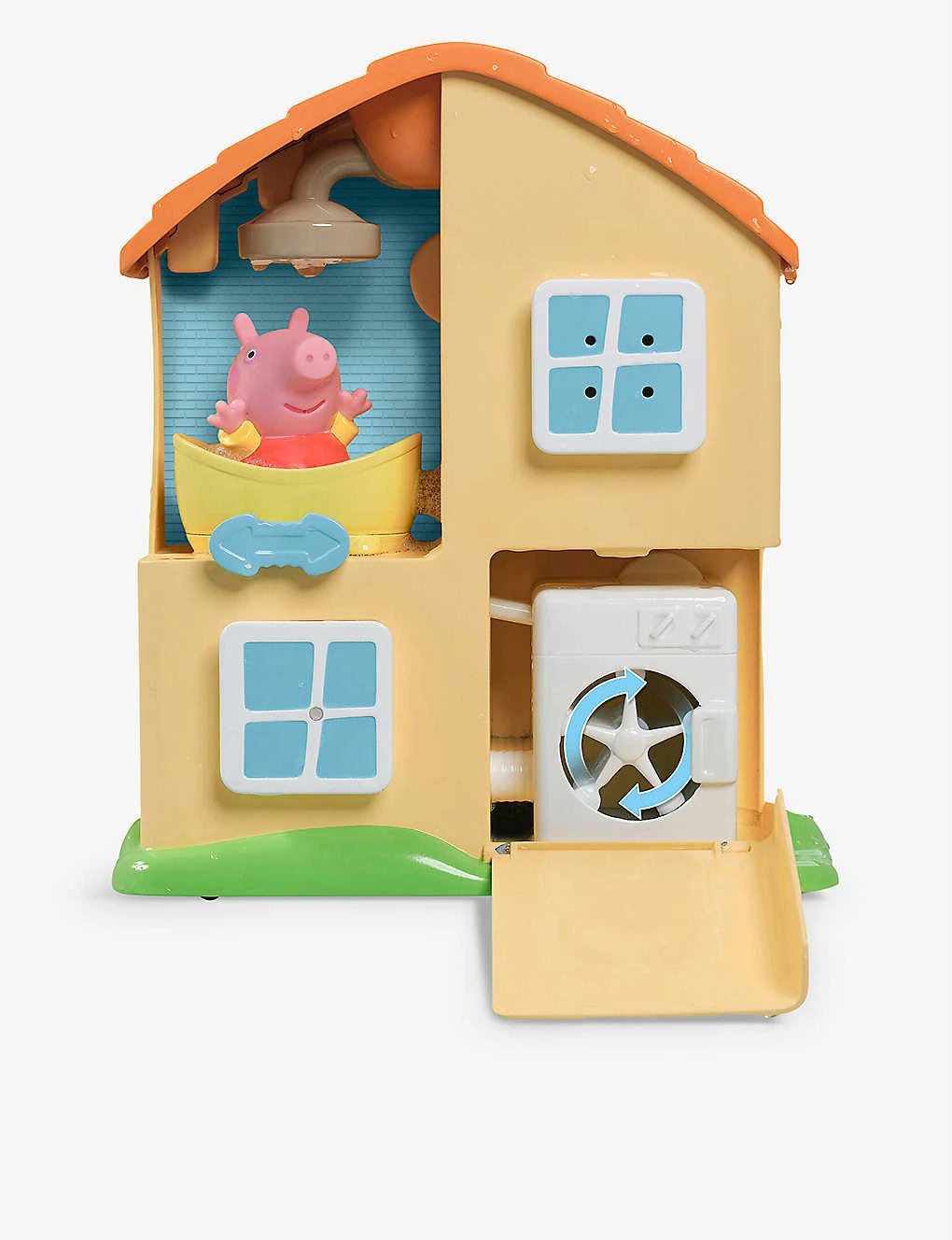 - House design, suction pads at the back, two water pourers, functioning shower, bathtub water can be sent down the pipe to the washing machine, two shape-sorting windows, Peppa Pig squirter