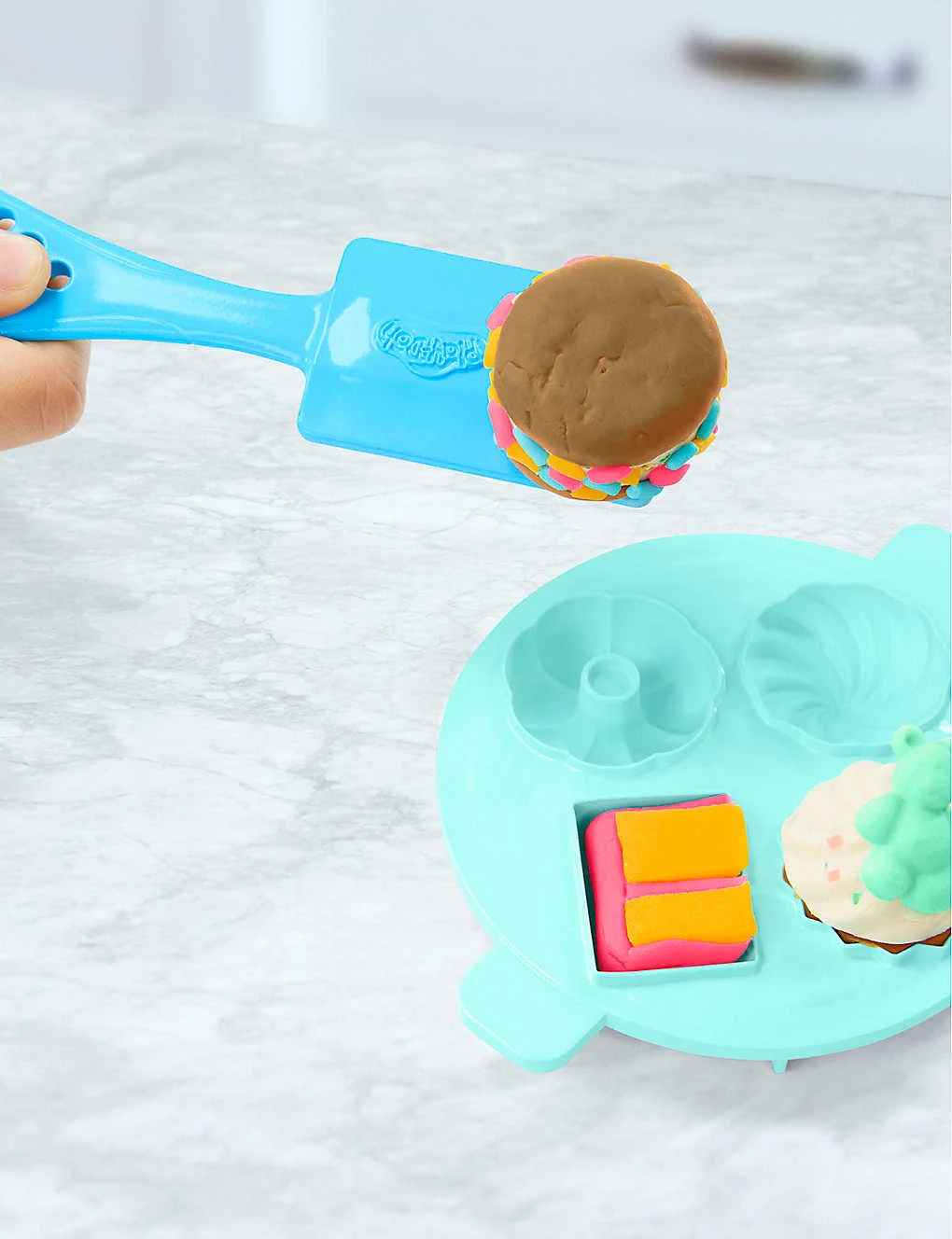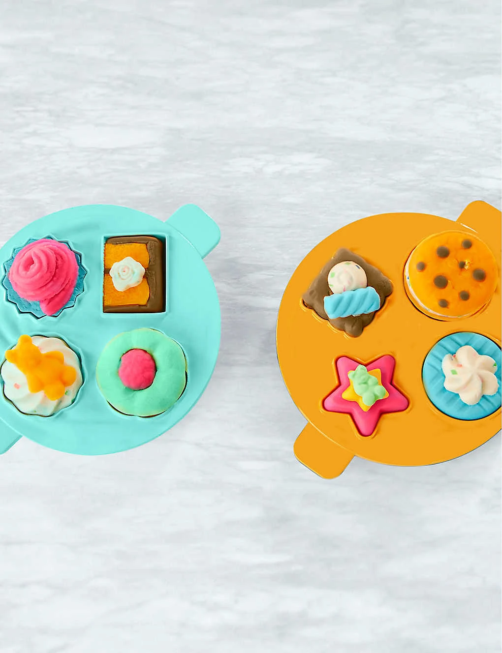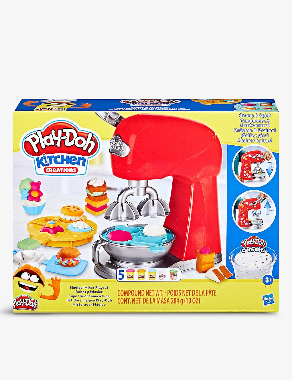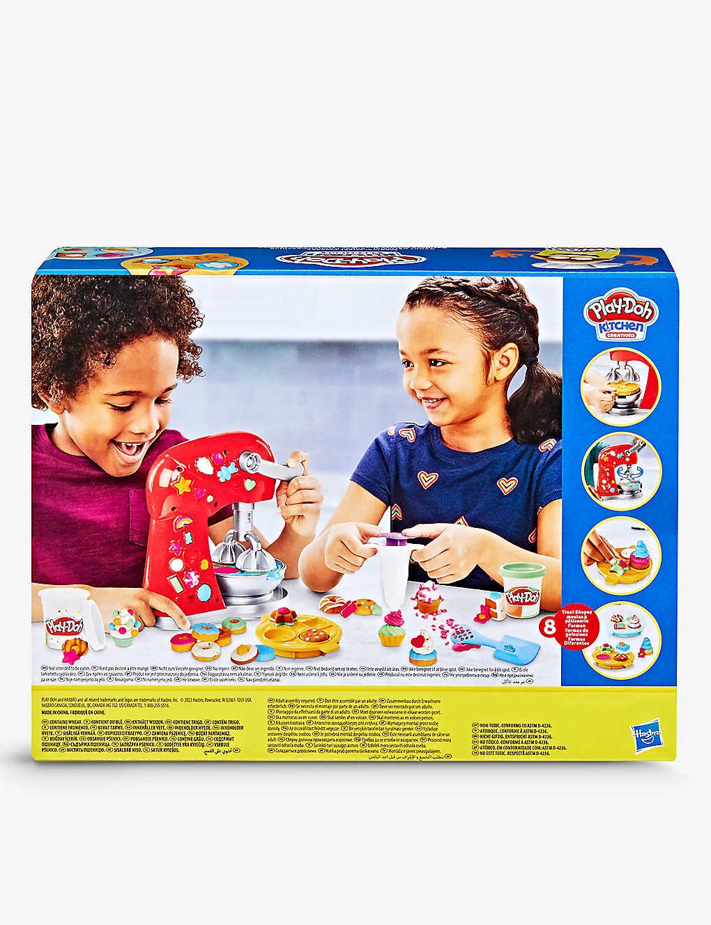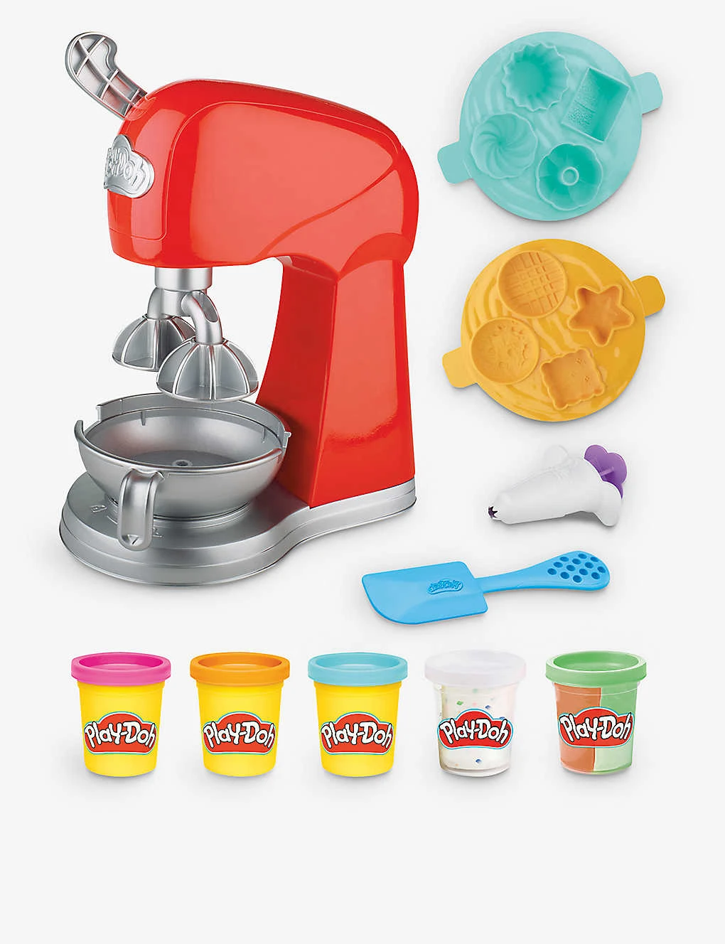 - 1x stand mixer playset with removable bowl, 1x extruder, 1x spatula accessory, 2x tray moulds & 5x cans Play-Doh modelling compound (56g in each can)
