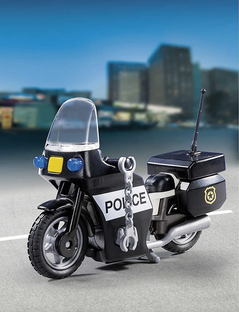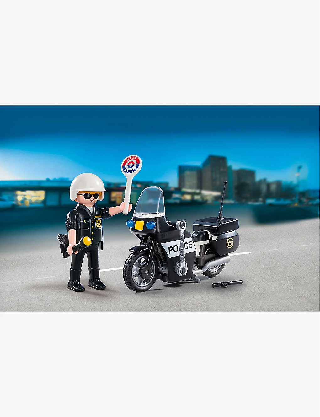 - Includes: 1 x motorcycle policeman figure, 1 x motorbike, 1 x truncheon, 1 x gun, 1 x set of handcuffs, 1 x torch, 1 x STOP police paddle
