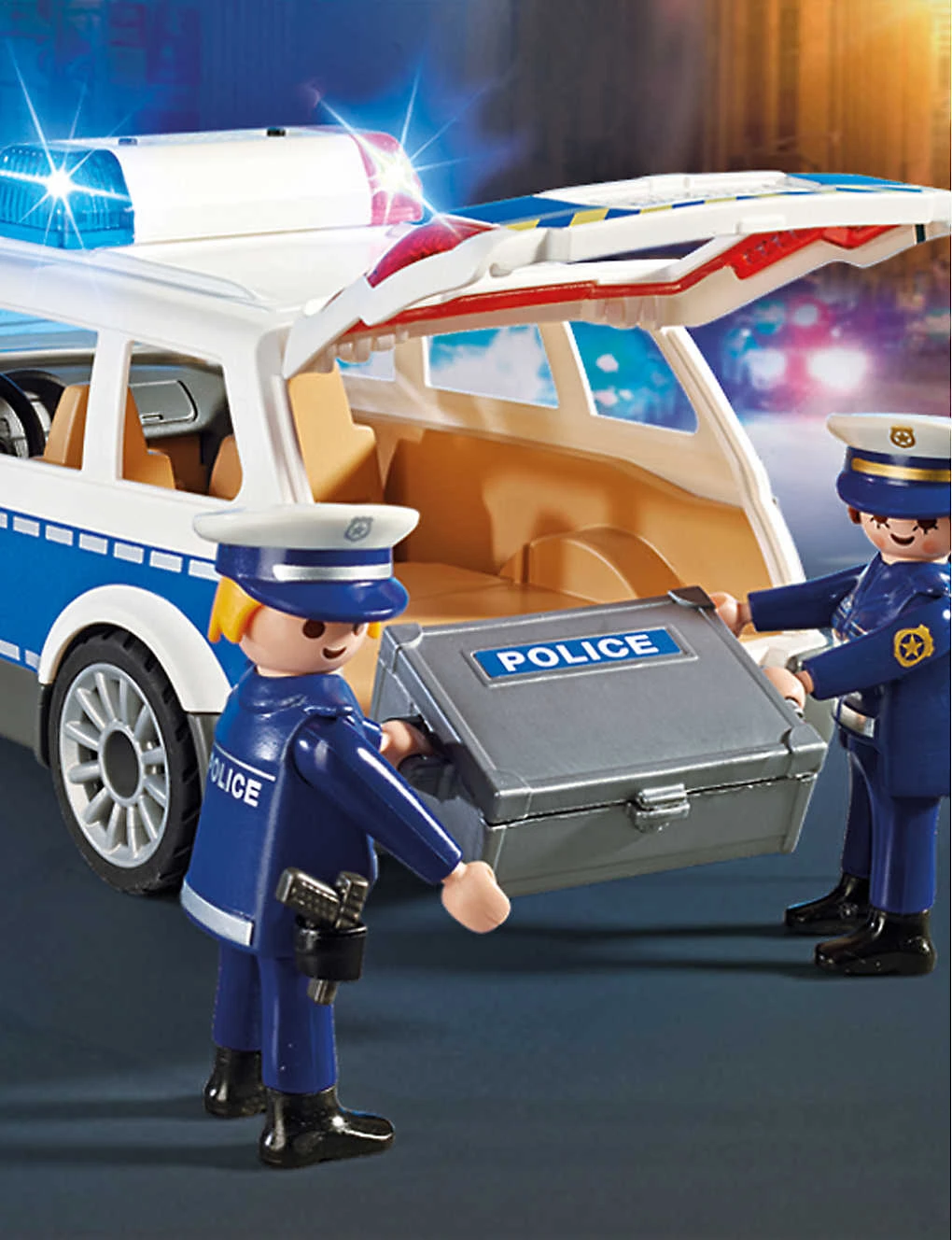 - Features: 1 x toy car, 2 Playmobil police officers, 1 x storage case, themed accessories