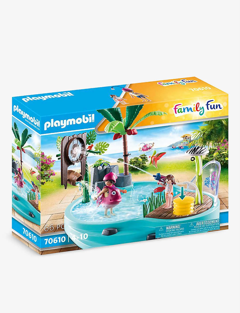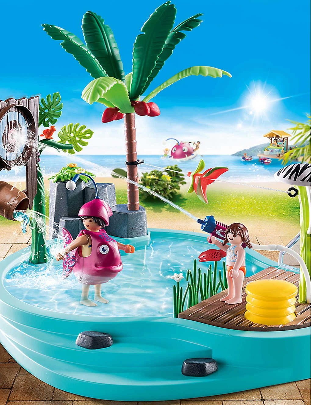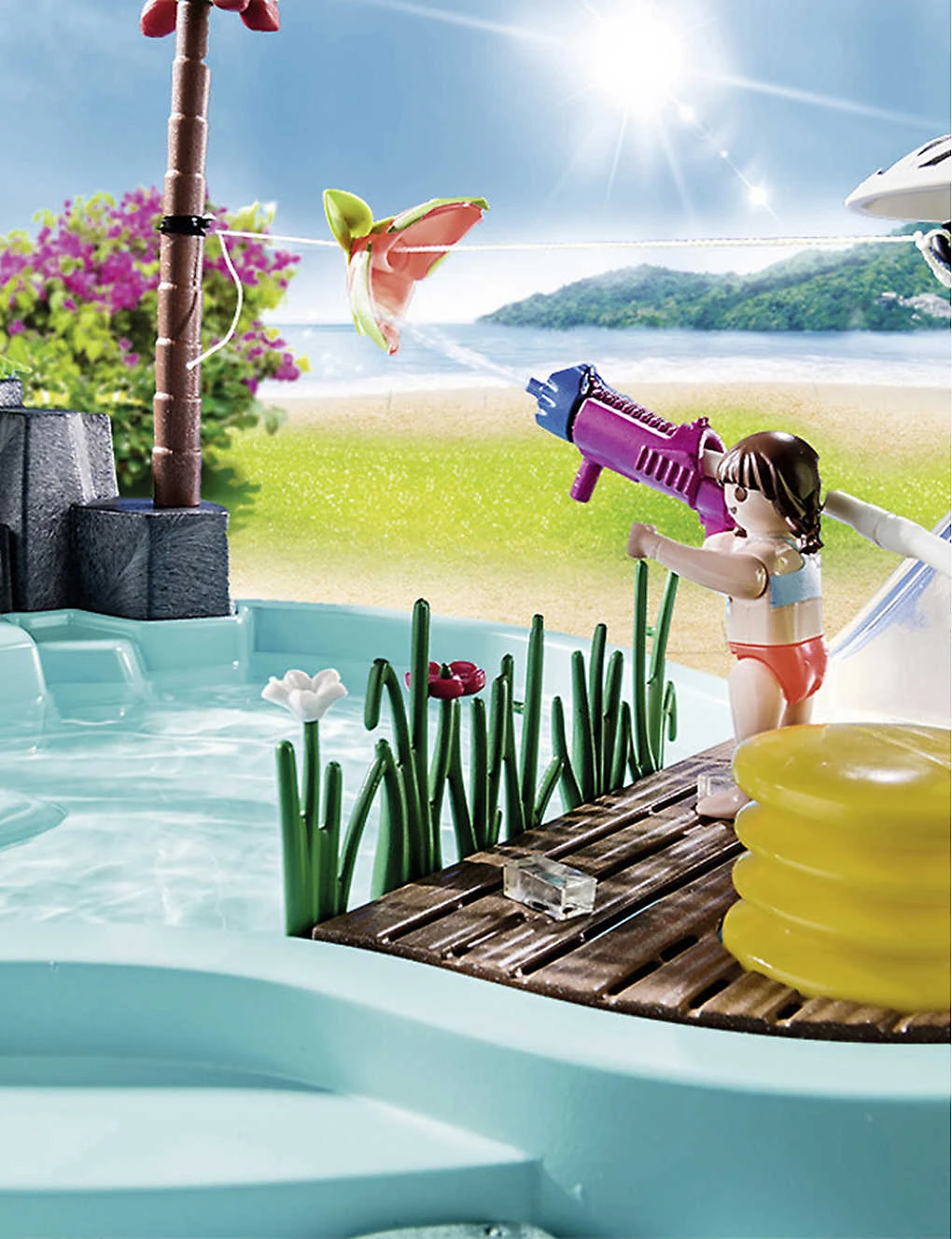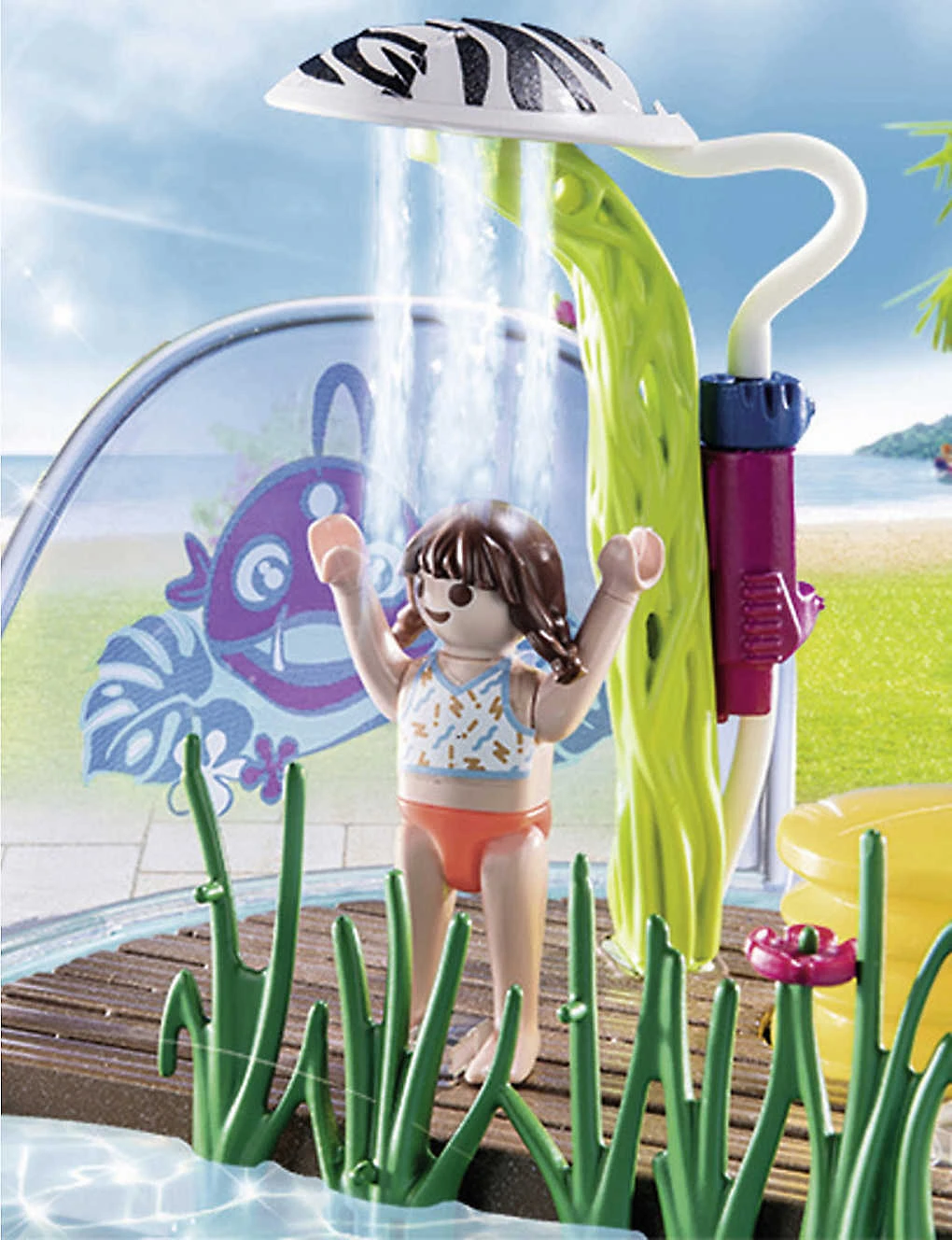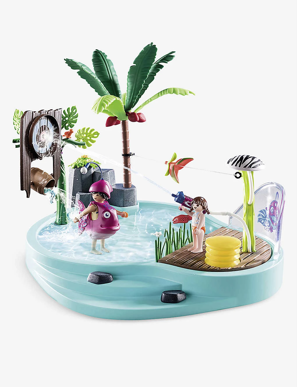 - Includes: 65 pieces including two figures, a pool, a water sprayer, a shower with a pump, three hoses, a palm tree, a fish costume and more