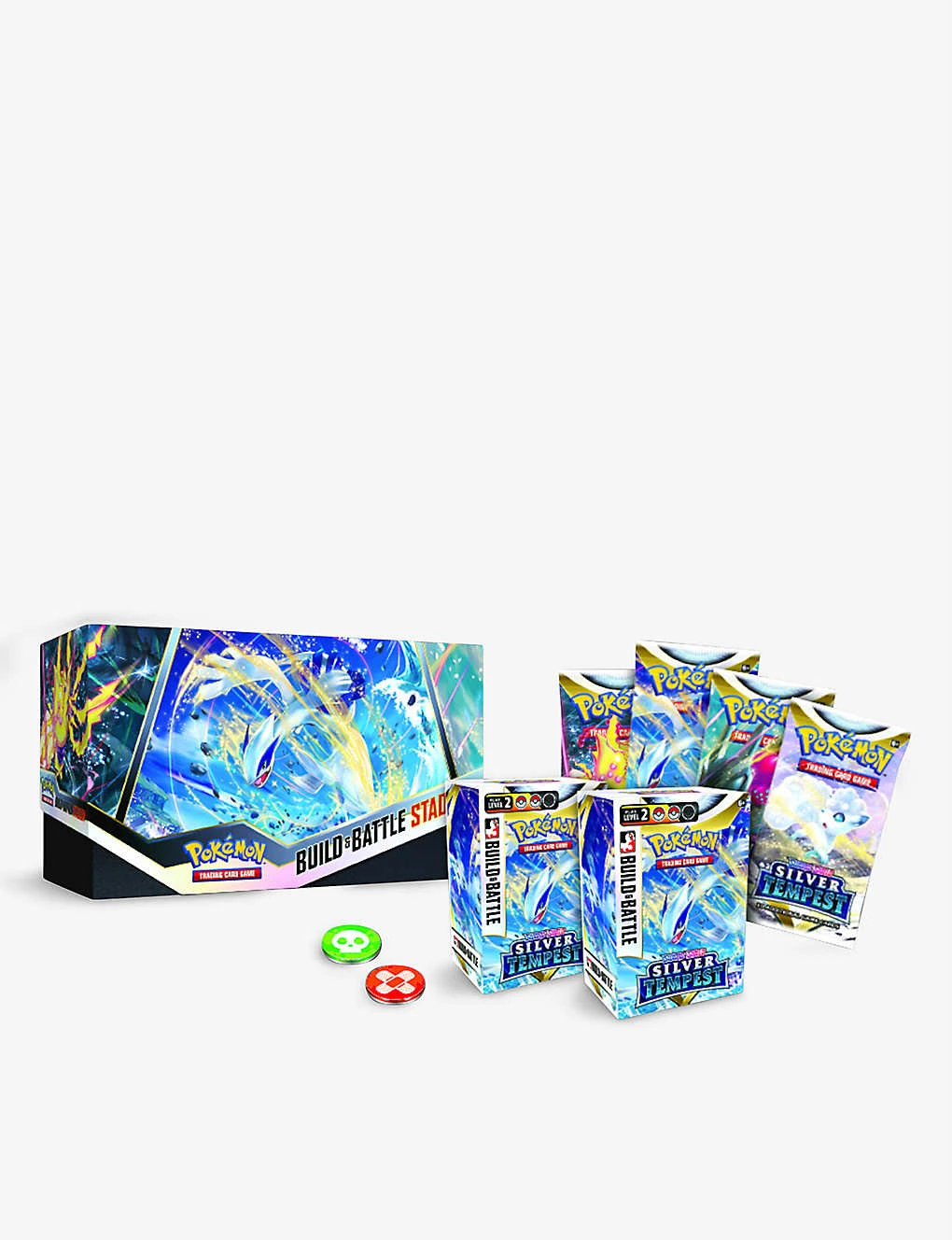 - Includes: 2 individual Build & Battle Boxes, each containing a ready-to-play 40-card deck, 4 additional Sword & Shield—Silver Tempest booster packs, 121 basic Energy cards, 6 damage-counter dice, 1 competition-legal coin-flip die, 2 acrylic condition markers