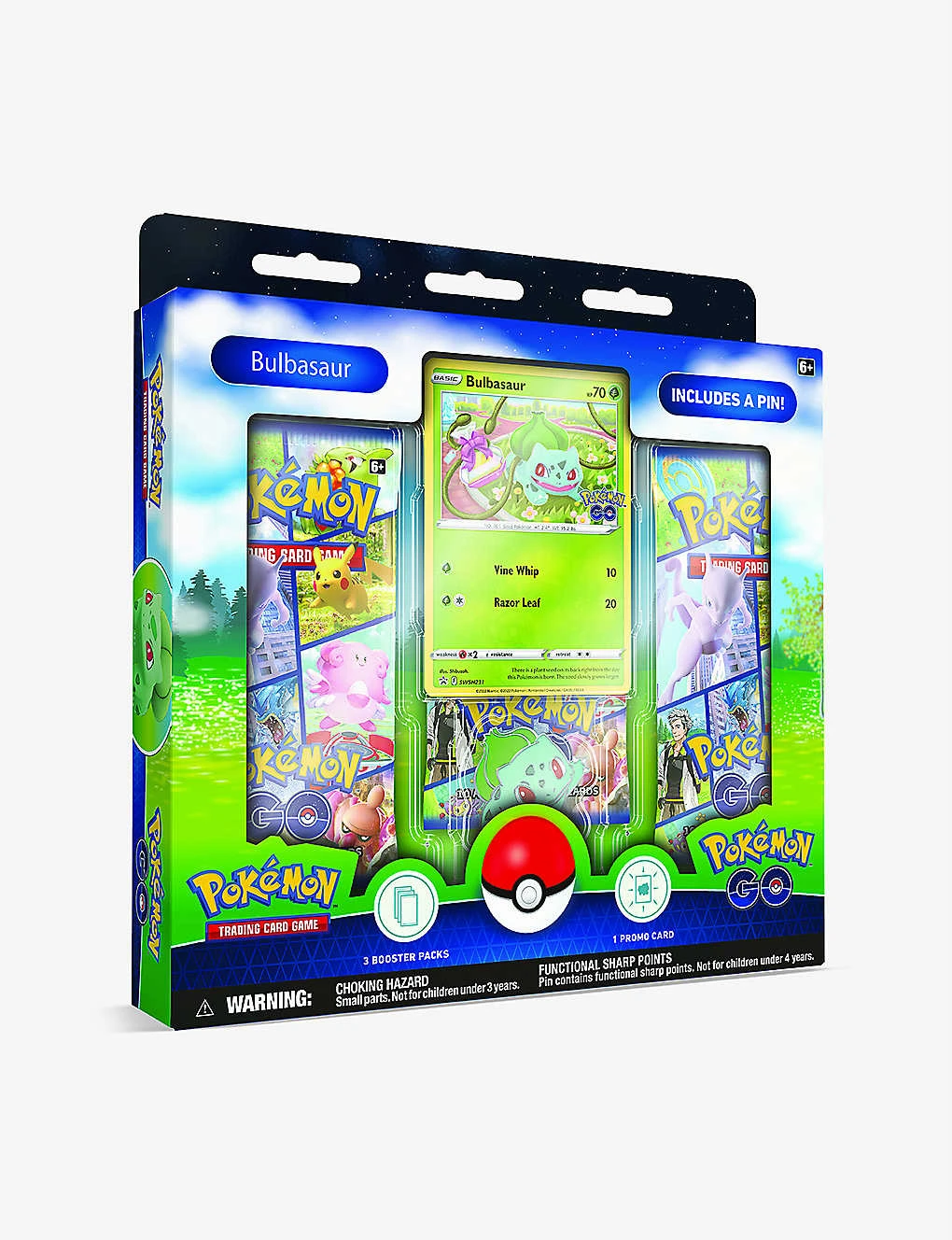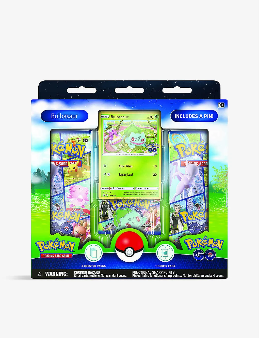 - Includes 1 foil promo card featuring Bulbasaur, a collector’s pin featuring Bulbasaur, 3 Pokémon GO booster packs, a code card for Pokémon TCG Live
