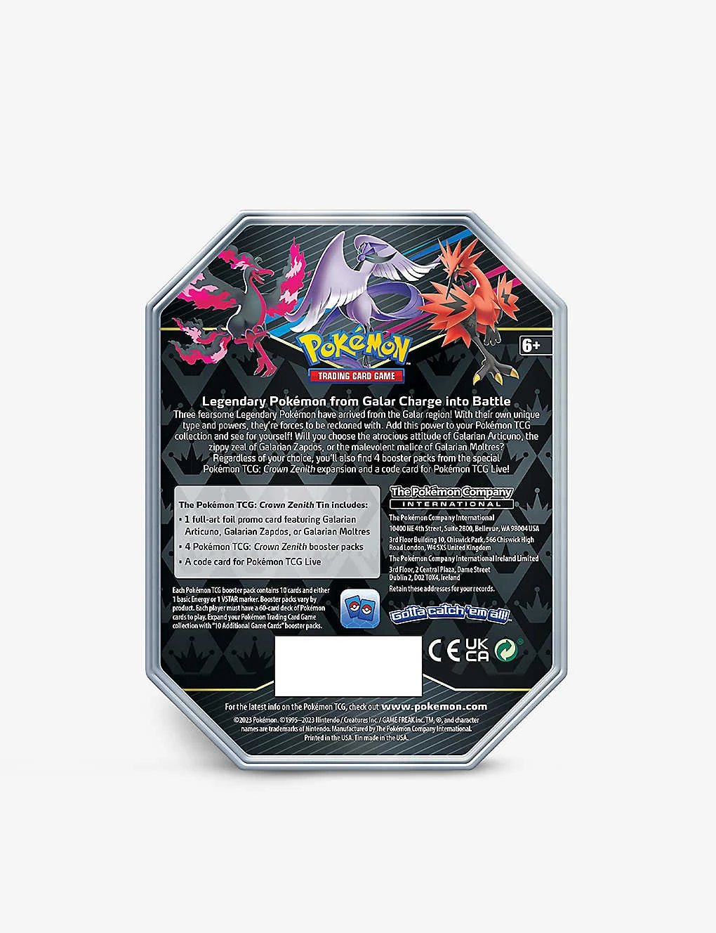 - Includes: one x full-art foil promo card, four x Pokémon TCG: Crown Zenith booster packs, Galarian Moltres branded tin