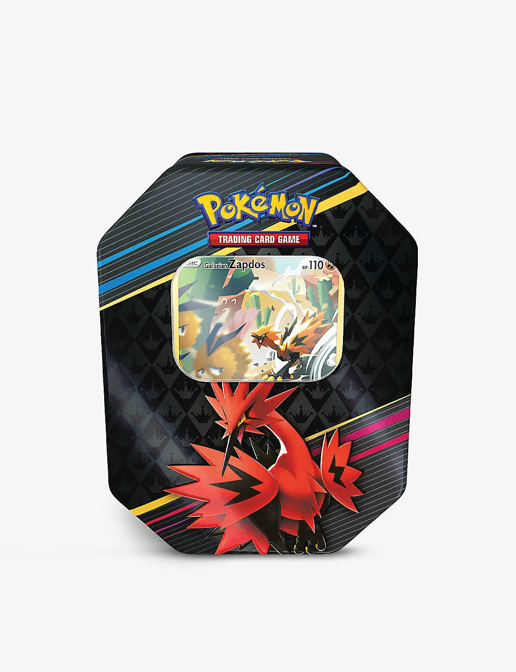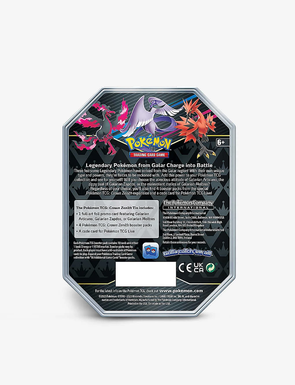 - Includes: one x full-art foil promo card, four x Pokémon TCG: Crown Zenith booster packs, Galarian Zapdos branded tin