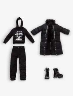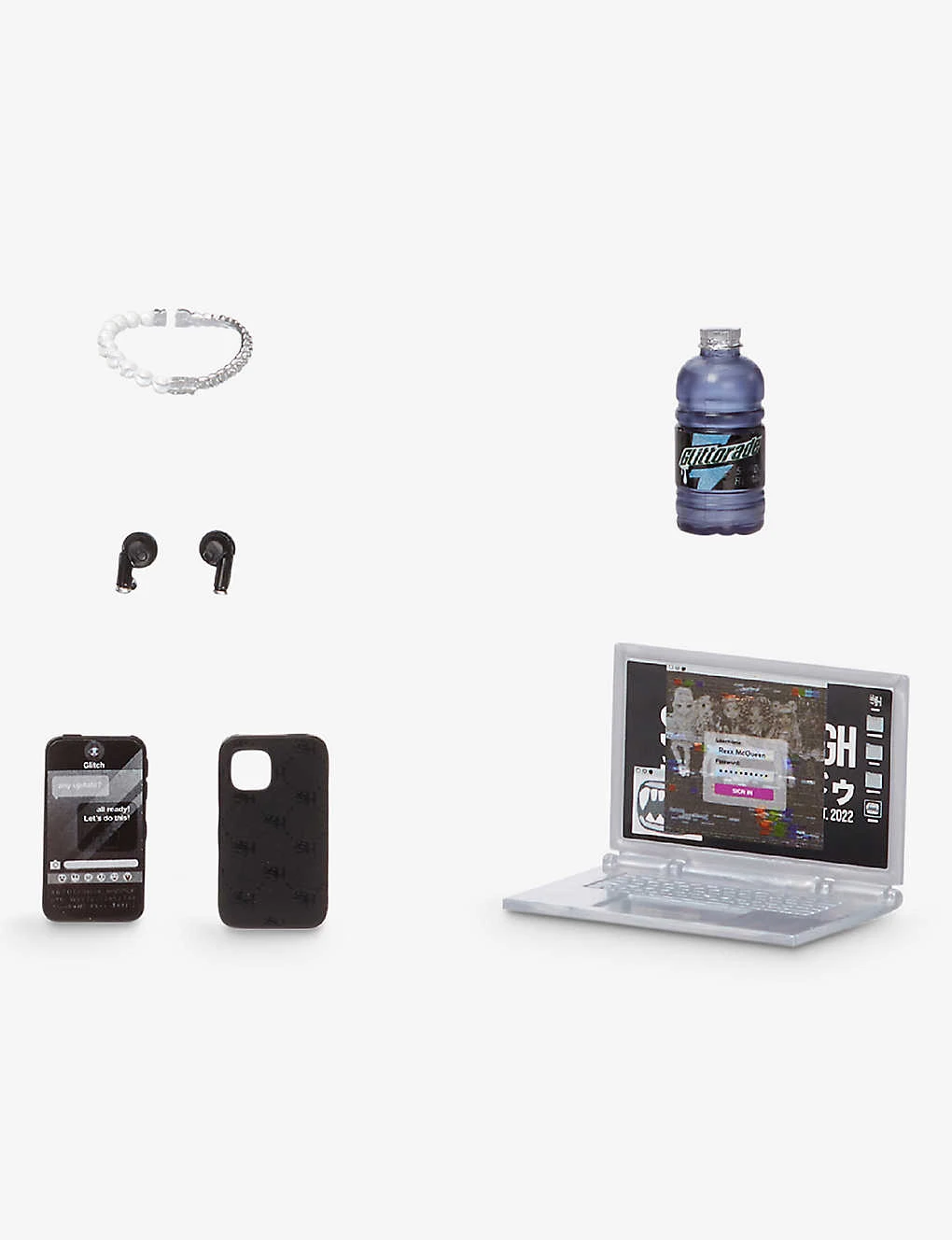 - Includes: 1x fashion doll with stand, 1x outfit, 1x pair of doll shoes, 1x comb, 2x hangers, 1x laptop, 1x mobile phone and case, 1x pair of air pods, 1x bottle