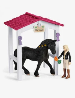 - Includes: 1x horse box, 1x girl, 1x Frisian mare, 1x chihuahua, 1x saddle, 1x bridle and reins, 1x hay rack, 1x trough, 1x carrot, 1x trophy, 1x gold medal, 2x prize ribbons, 1x helmet, 1x sticker sheet, 1x assembly instructions.