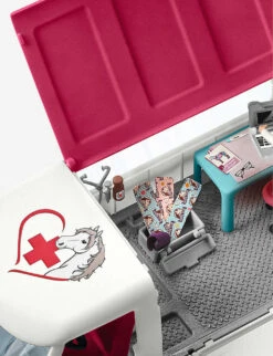- Includes: car, vet, Hanoverian foal, medical bag, stethoscope, syringe, medicine bottle, laptop, X-ray machine, bandage, halter, apple, table, chair, prescription pad, plasters sticker sheet, sticker sheet, assembly instructions