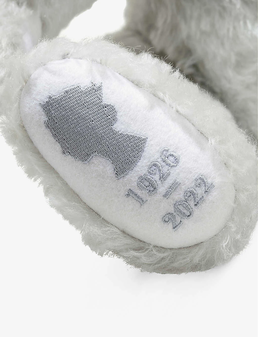 - Regal theme, branded button in ear, string pearl necklace, moveable head, arms and legs, embroidered royal cypher on right foot, date embroidered on left foot