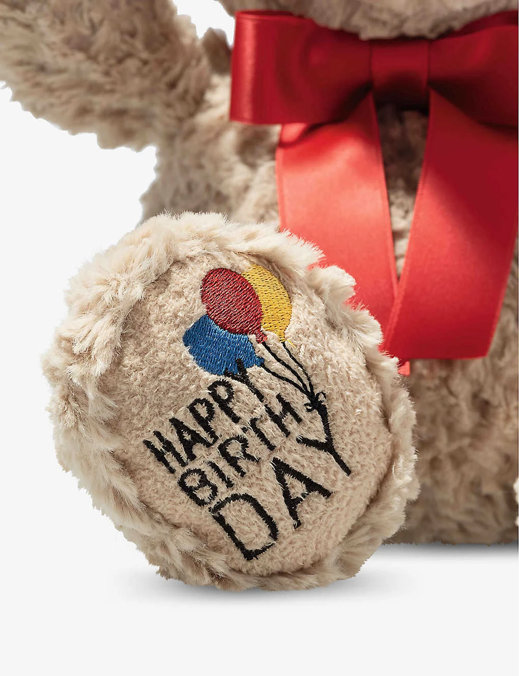 - Ribbon bow, branded stainless steel button on ear, embroidered ‘Happy Birthday’ words on right foot, granulate bags in the base to allow for sitting up